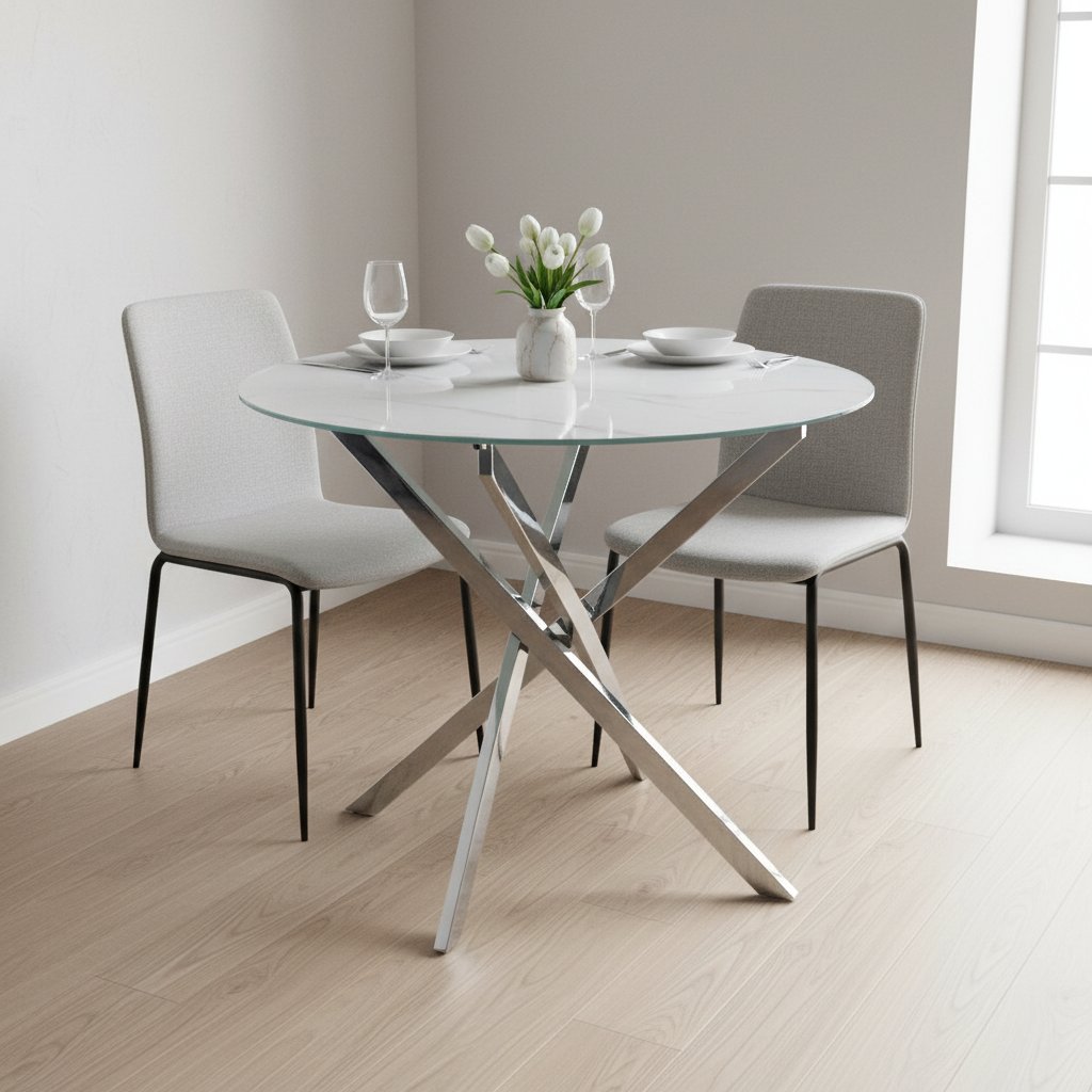 Az AGIS kerek étkezőasztal ízléses és praktikus darab, amely étkezője vagy konyhája domináns darabja lesz. A dizájn kerek formájának köszönhetően érdekes. Az asztal krómozott fém lábai modern fekete dizájnnal eleganciát kölcsönöznek. Az asztal négy személy számára alkalmas, magassága 71 cm, átmérője 90 cm. Az asztal színe fehér, márványhatású.