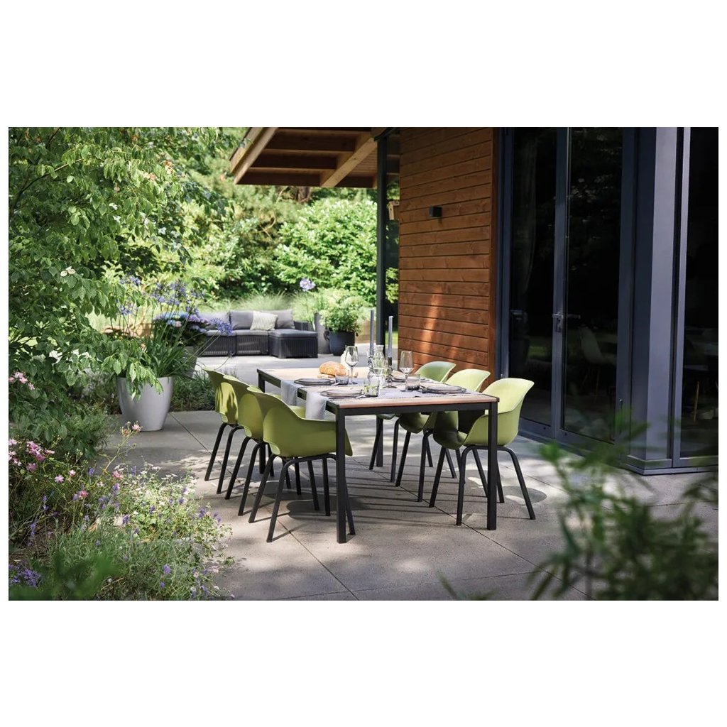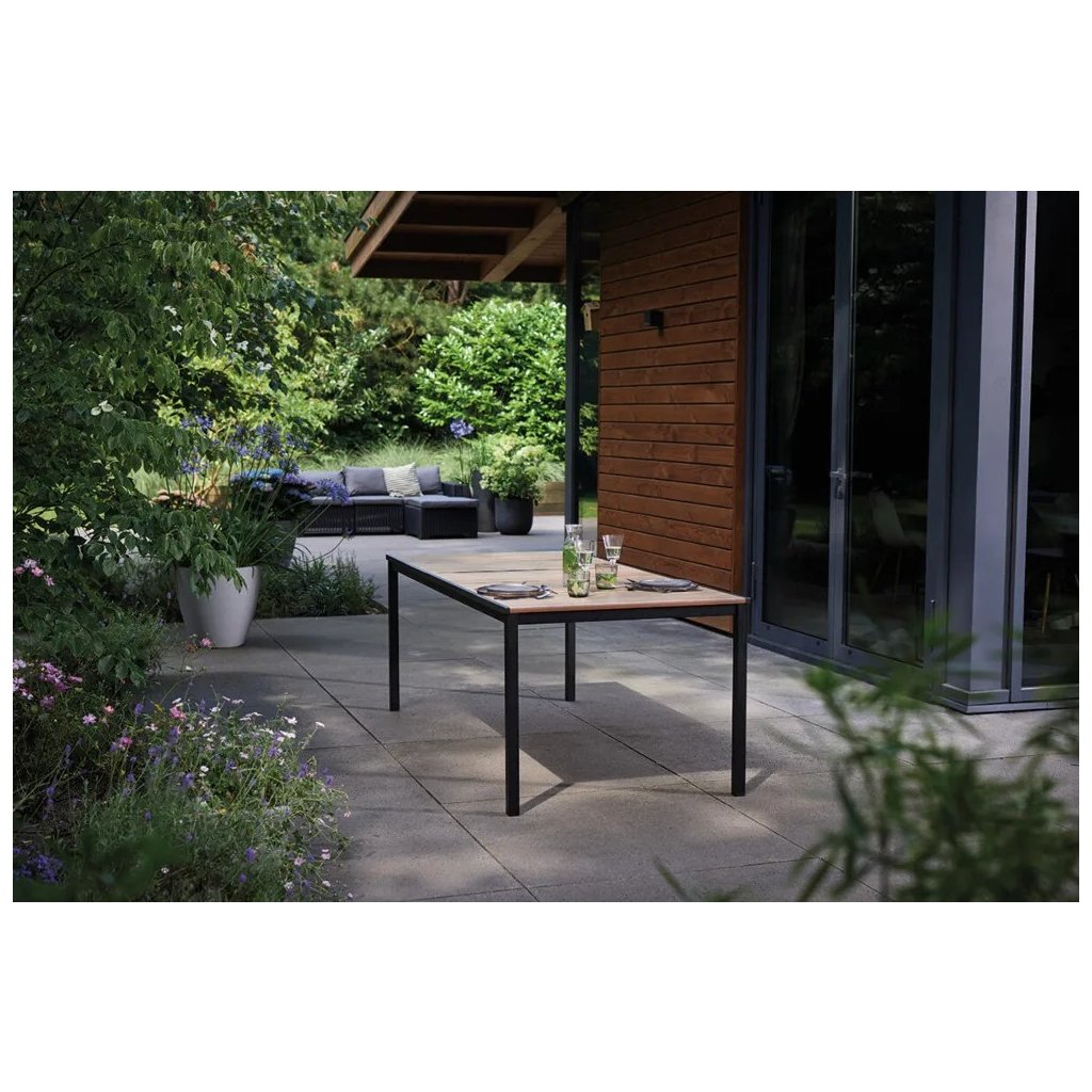 HARBOR kerti asztal | A hamu minőségi anyagokból készül. A fém konstrukció kivételes stabilitást biztosít, míg a műanyag asztallap kőrisfa díszítéssel természetes és elegáns megjelenést kölcsönöz az asztalnak. A felhasznált speciális anyag nemcsak vizuálisan vonzó, hanem rendkívül ellenálló az időjárás viszontagságaival szemben is. Kiváló minőségének és hosszú élettartamának köszönhetően ez az asztal megbízható társ lesz sok éven át .