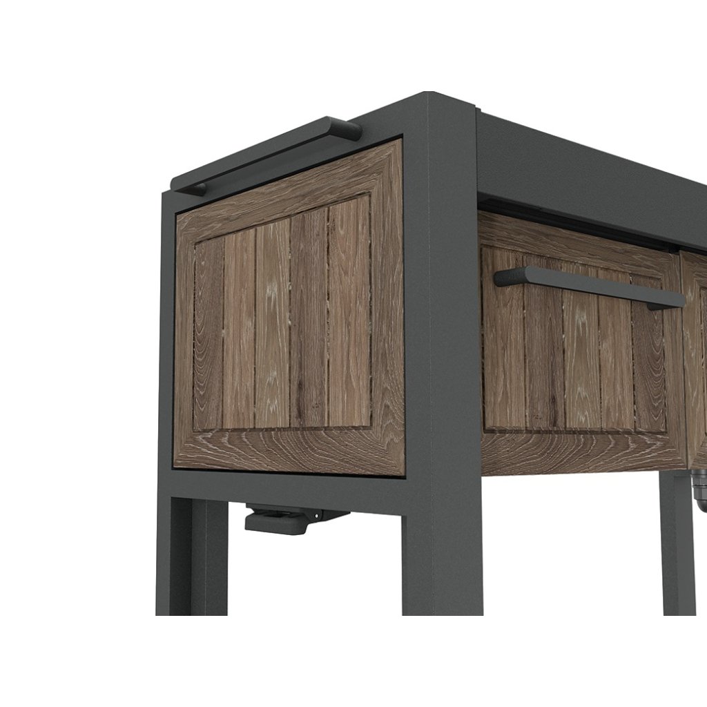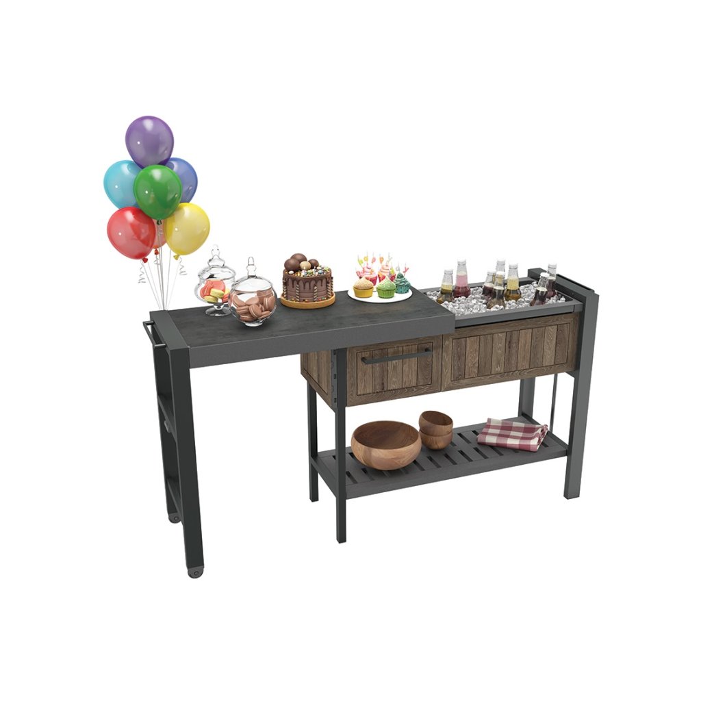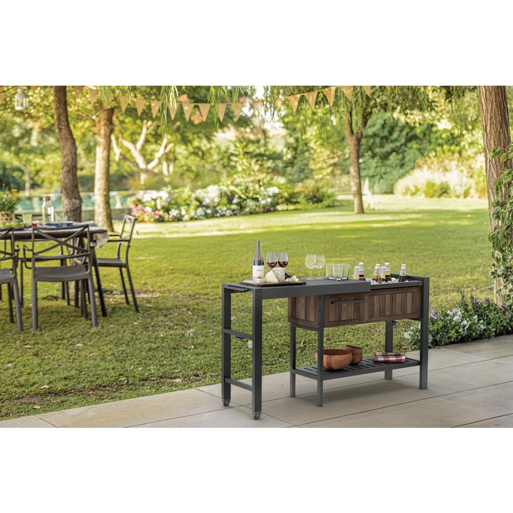 A HOST PARTY kerti asztal egy innovatív megoldás, amely azonnal átalakít egy feltűnésmentes díszpolcot elegáns és teljesen funkcionális tálalóhellyé . Egyszerűen csúsztassa ki a polcokat, hogy további helyet nyerjen harapnivalóknak, italoknak vagy dekorációknak, így ideális társ lehet ünnepségeken, partikon vagy családi összejöveteleken. A rejtett kerekek könnyű kezelést biztosítanak , és lehetővé teszik, hogy az asztalt gyorsan oda helyezze, ahová szüksége van rá. A praktikus felső fiók és a belső tárolóhely elegendő helyet biztosít a szükséges kiegészítők, edények vagy dekorációk tárolására.