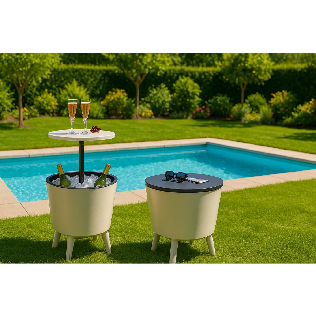 A multifunkcionális kerti COLD BAR összecsukva praktikus asztalként szolgál, kibontva pedig klasszikus bárként szolgálhat dobozos italhűtővel a forró nyári napokon. Lenyűgöző lesz elegáns dizájnjával, funkcionalitásával és praktikumával. Élvezze a nyári bulikot barátaival és családjával , tökéletesen hűtött italok mellett. A kerti bárasztal nem feltűnő krémszínű.