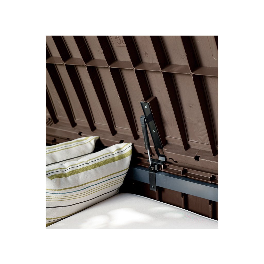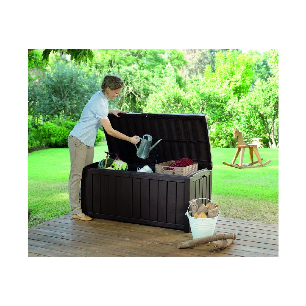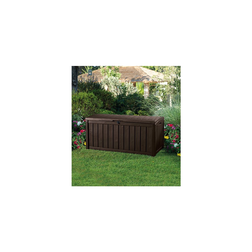 Kerti GUTTERWOOD doboz 390L | A barna összeszerelése egyszerű, szerszámok használata nélkül . Az anyag UV védelemmel rendelkezik, és ellenáll a kedvezőtlen időjárási viszonyoknak. Az egyszerű használat és szállítás érdekében a doboz elülső és oldalsó fogantyúval van felszerelve.