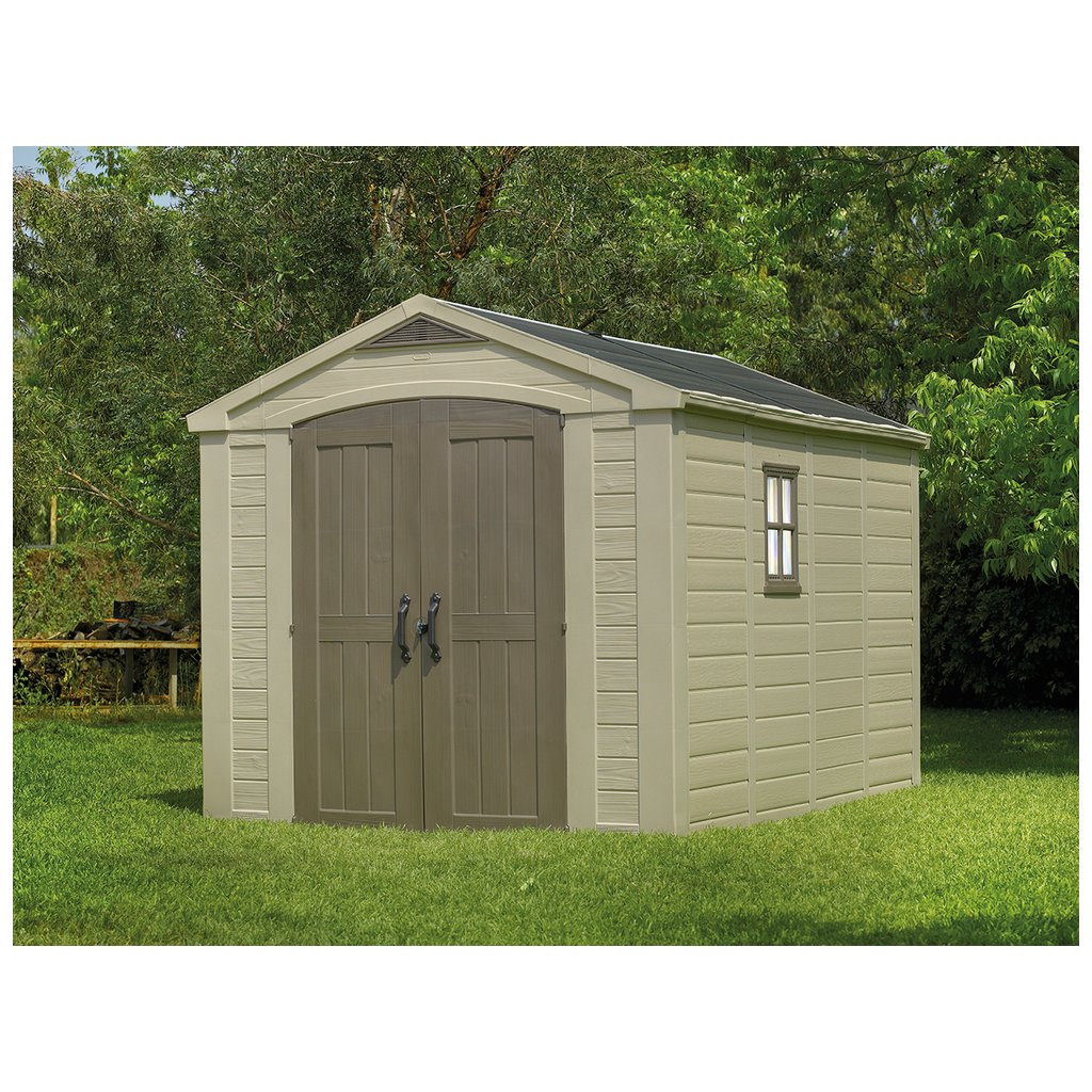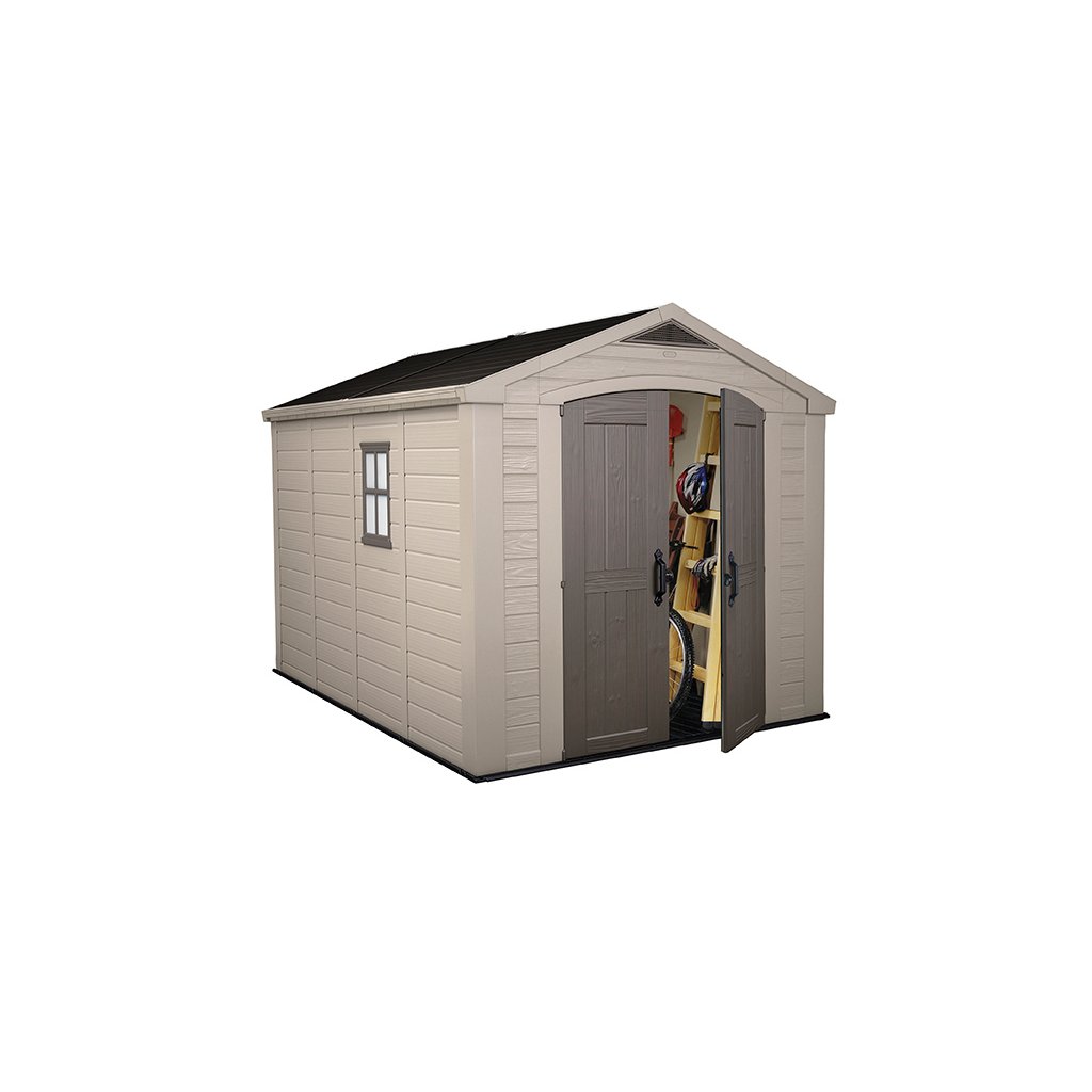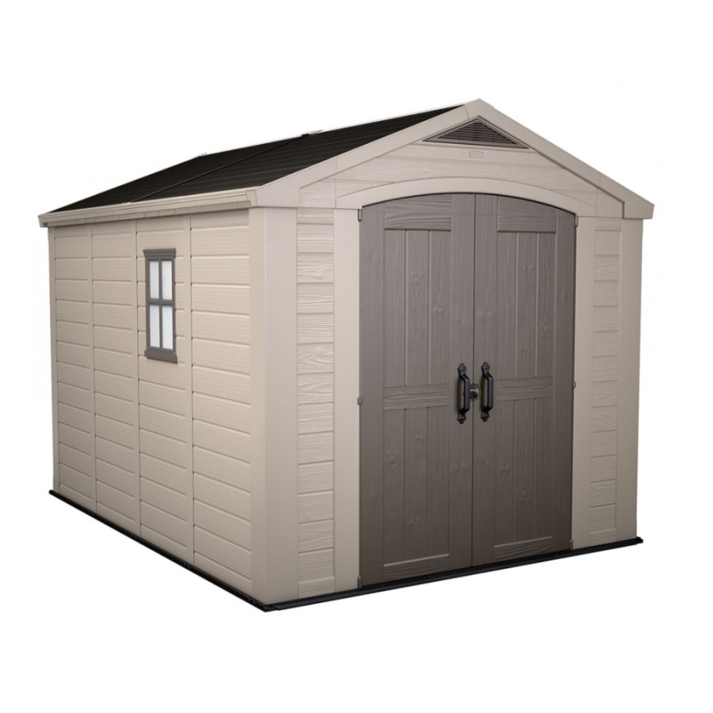 Az AGENT 8x11 kerti házat úgy tervezték, hogy Kiváló minőségű műanyagokból készült, amelyek ellenállnak az időjárás viszontagságainak, a nedvesség behatolásának és a mechanikai sérüléseknek. A megerősített acélváz , a dupla ajtók és a beépített ablakon keresztül bejutó elegendő világítás a ház nagy előnye. Nem igényel karbantartást , és nem korróziónak, lágyulásnak vagy anyagbomlásnak van kitéve. Minden ház rendkívül tartós padlóval van felszerelve . Értékelni fogja a nagyon egyszerű összeszerelést, a padlópanelt, de a beépített polctartókat és a két polcot is. A ház zárható, szellőző és karbantartásmentes . Nagy előnye a víz-, hó- és UV-sugárzásállóság .