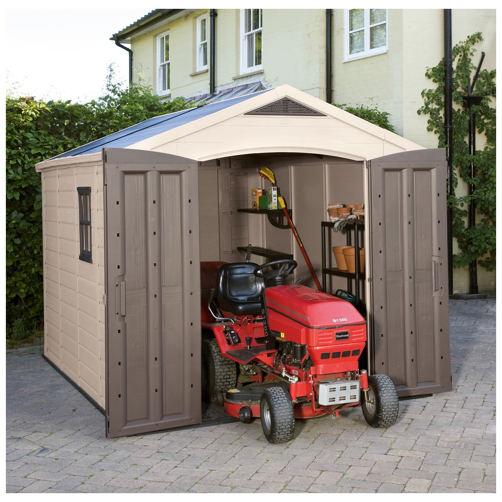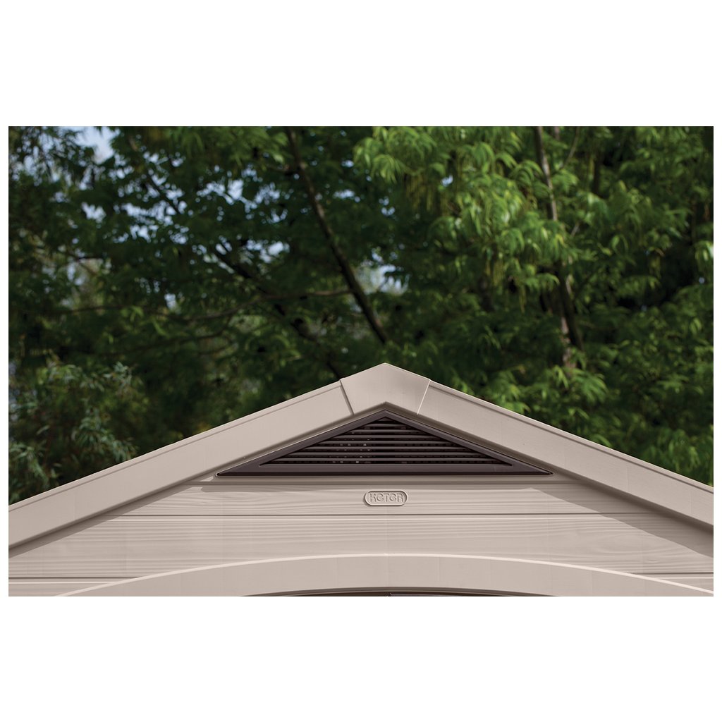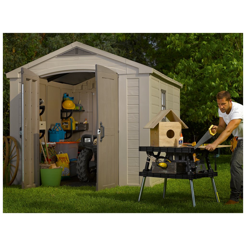 Az AGENT 8x11 kerti házat úgy tervezték, hogy Kiváló minőségű műanyagokból készült, amelyek ellenállnak az időjárás viszontagságainak, a nedvesség behatolásának és a mechanikai sérüléseknek. A megerősített acélváz , a dupla ajtók és a beépített ablakon keresztül bejutó elegendő világítás a ház nagy előnye. Nem igényel karbantartást , és nem korróziónak, lágyulásnak vagy anyagbomlásnak van kitéve. Minden ház rendkívül tartós padlóval van felszerelve . Értékelni fogja a nagyon egyszerű összeszerelést, a padlópanelt, de a beépített polctartókat és a két polcot is. A ház zárható, szellőző és karbantartásmentes . Nagy előnye a víz-, hó- és UV-sugárzásállóság .