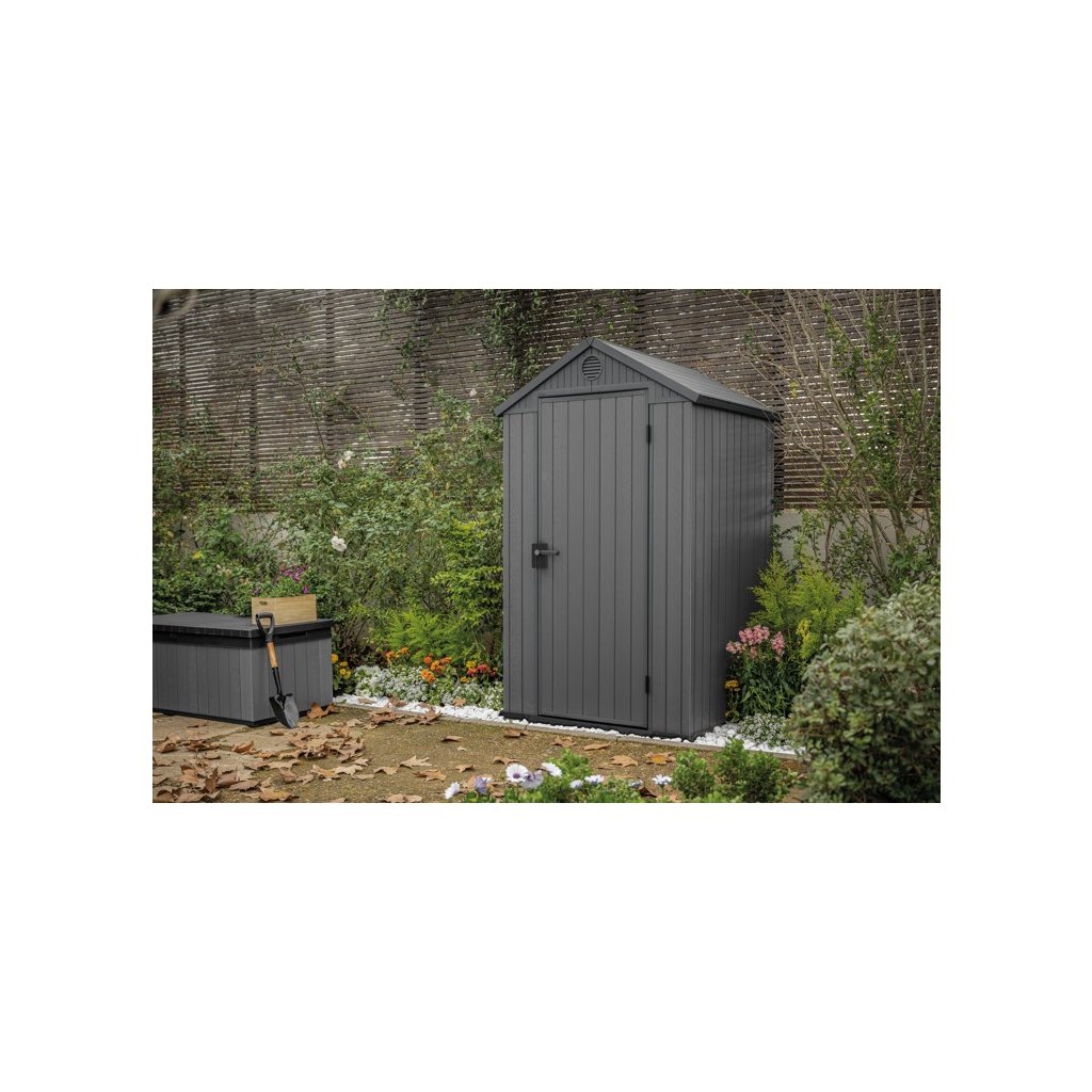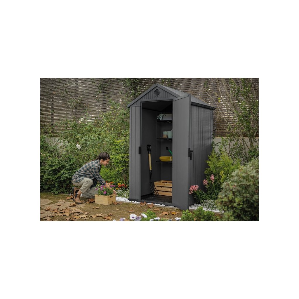 A karbantartásmentes CHARLES 4x4 kerti fészer azoknak a felhasználóknak az igényeit szolgálja ki, akik praktikus és stílusos megoldást keresnek kerti kiegészítőik tárolására. A nagy belső tér lehetővé teszi mindenféle kerti kiegészítő és felszerelés tárolását. A fészer kellemes szürke színű. A polcok nem részei a kerti fészernek, de külön megrendelhetők - Polcok a kerti fészerhez POLCCÉSZLET 100 .