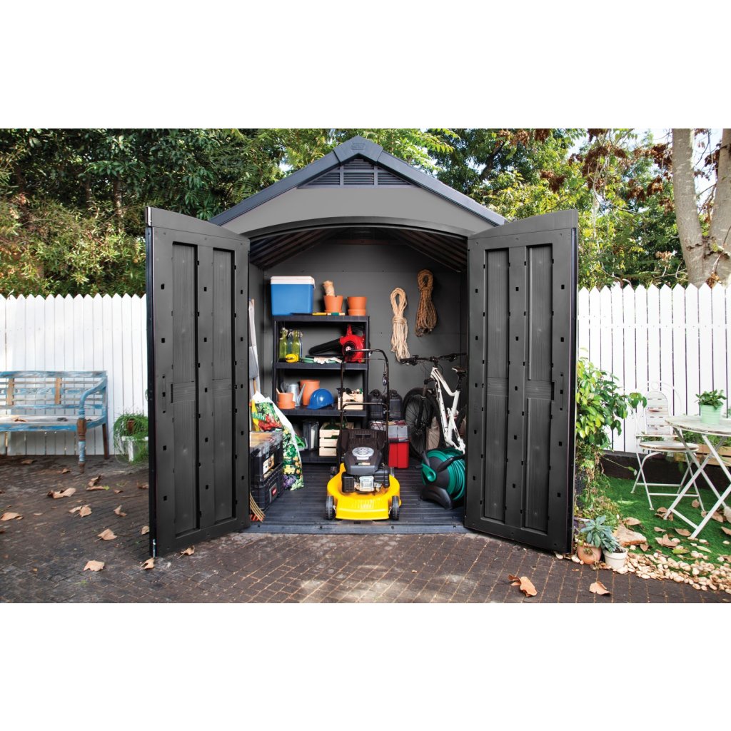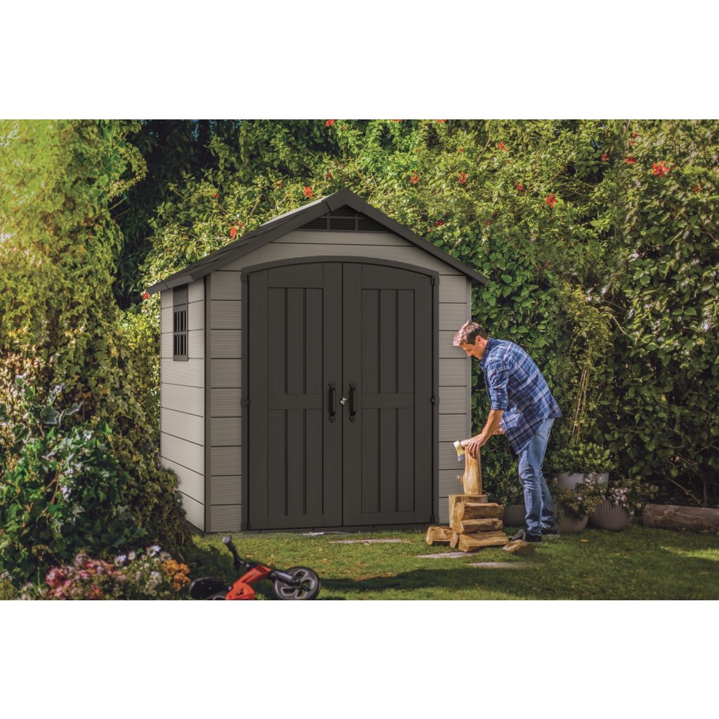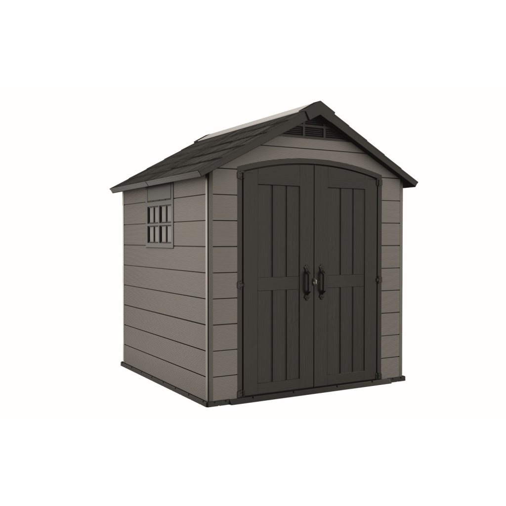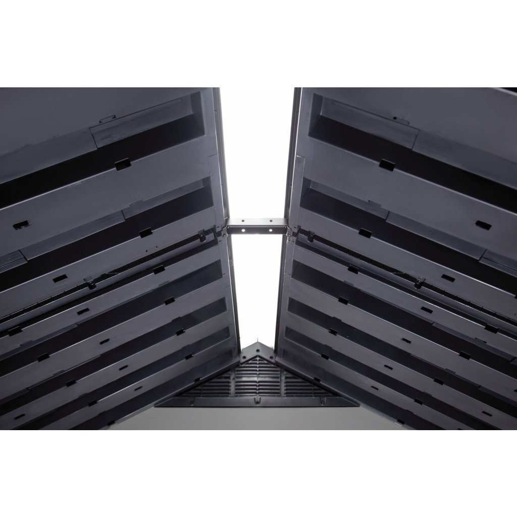 A karbantartásmentes PRESIDENT 757 kerti fészer ideális nemcsak szerszámok és kerti kiegészítők tárolására, hanem fűnyíró vagy grillsütő tárolására is. A lakat nem tartozék. A ház modern kialakítása ideális bármilyen kertbe. A polcok nem részei a kerti háznak, de külön megrendelhetők - Polcok kerti házhoz POLCCÉSZLET 100 .
