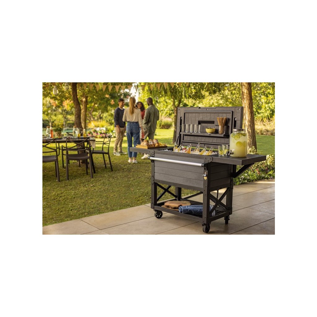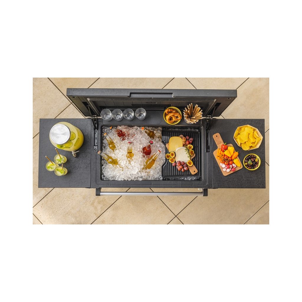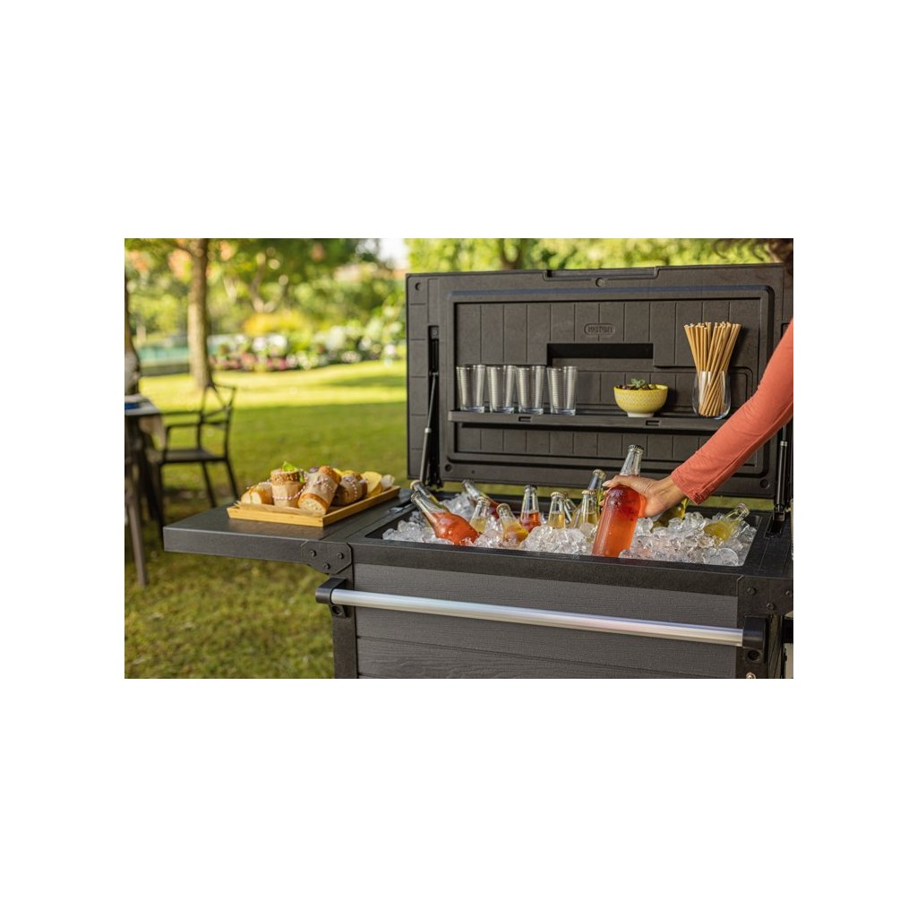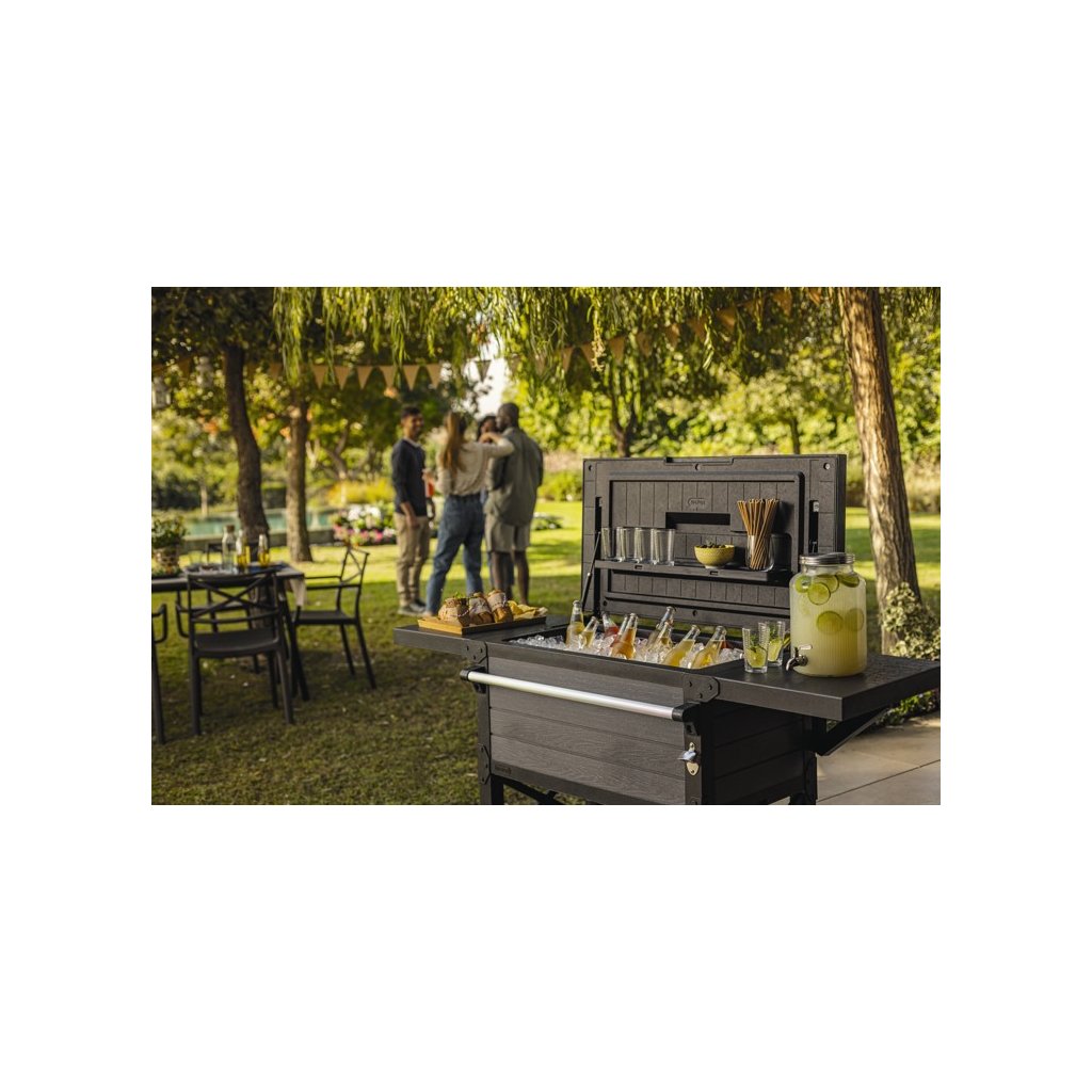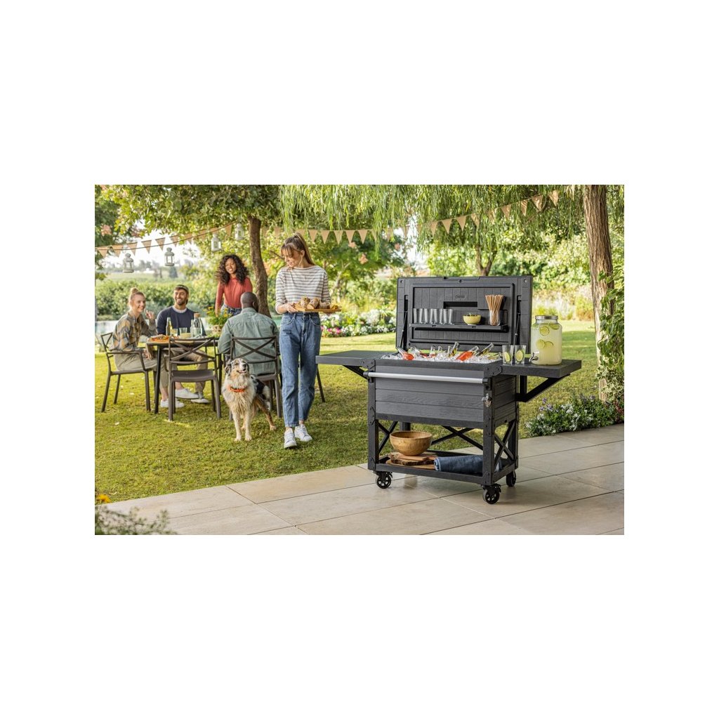 Stílusos BEVARCOO BAR kerti kocsi szürke színben italok hűsítésére. Ez a praktikus BEVARCOO BAR kerti kocsi nagyszerű bármilyen kültéri helyre, legyen az terasz, kert vagy erkély. A hűtőszekrénnyel lehetőséged van italok tárolására. A kocsi mindkét oldalán található billenthető polcok ideálisak további tárolóhelyként . A kerti kocsi forgó kerekekkel rendelkezik, amelyek megkönnyítik a kocsi mozgatását, de felszolgáláskor rögzíteni kell. Soha többé nem kell kompromisszumot kötnöd kedvenc italaid hőmérsékletével, és élvezheted a nyári bulikat barátaiddal és családoddal tökéletesen hűtött italokkal.