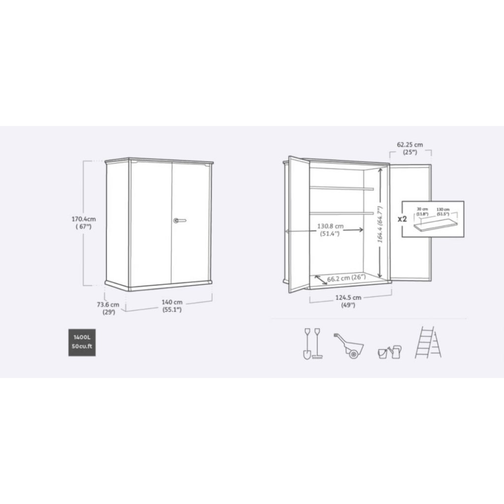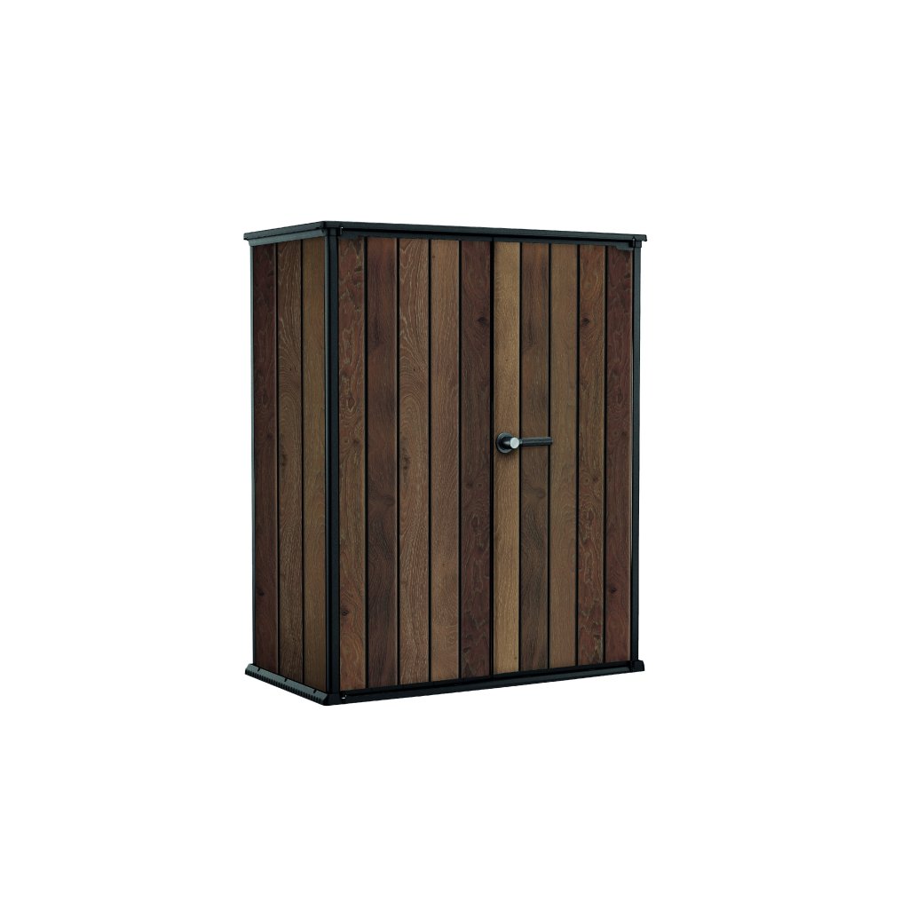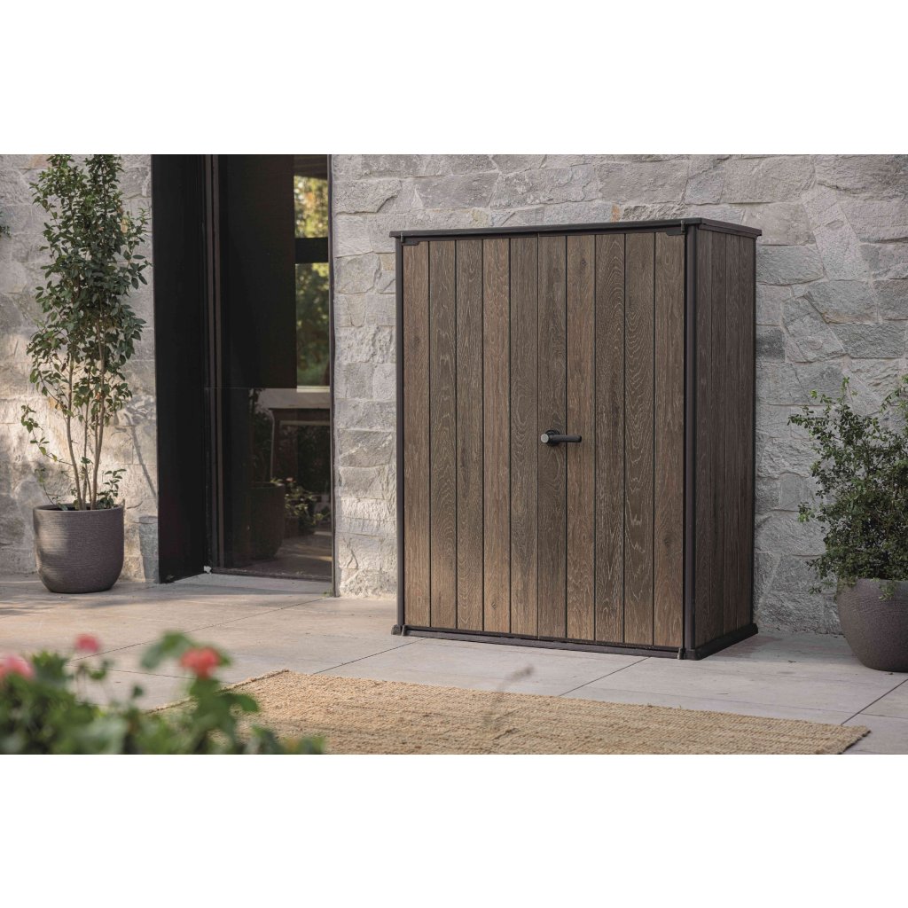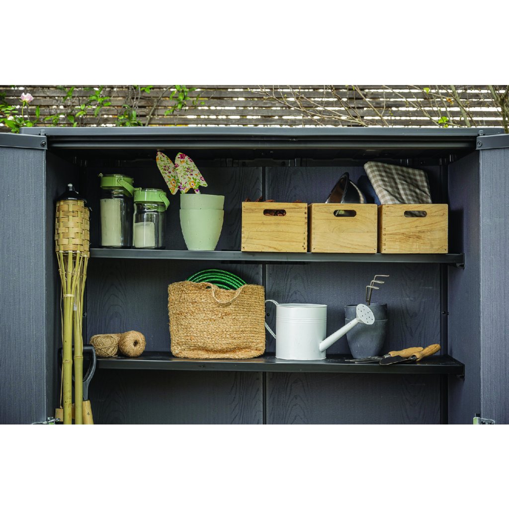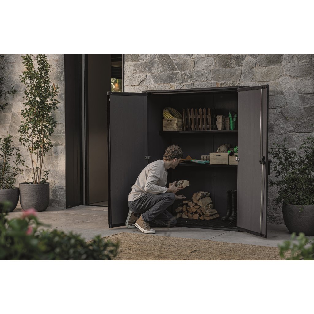 A SECTION BOX kerti szekrény rusztikus fa megjelenést kínál különböző árnyalatokban, modern és praktikus szekrény, amely stílusos kiegészítője lesz bármely kertnek, terasznak vagy erkélynek. A szekrényben bőséges, 1400 literes tárolóhely található kerti vagy grillezőszerszámok tárolására. Belül 2 polc található a dolgok rendezésére, a dupla ajtók pedig lakattal zárhatók (a zár nem tartozék).