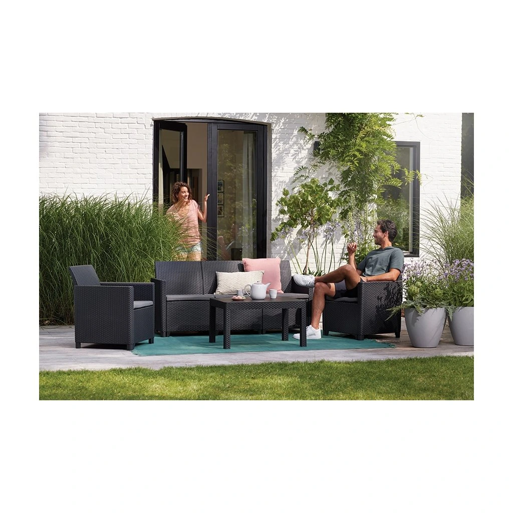A grafit színű CLARA 5 Orlando kerti asztal szett természetes rattan utánzatú, öntött műanyagból készült. A szett részét képező párnák kényelmes érzetet biztosítanak a pihenés pillanataiban. A modern és kényelmes kialakításnak köszönhetően... CLARA ül Teraszát vagy erkélyét pihenőhellyé varázsolhatja a különféle asztalok, fotelek és kanapék kínálatával. A szett egy 3 személyes kanapéból, 2 fotelből és egy asztalból áll.