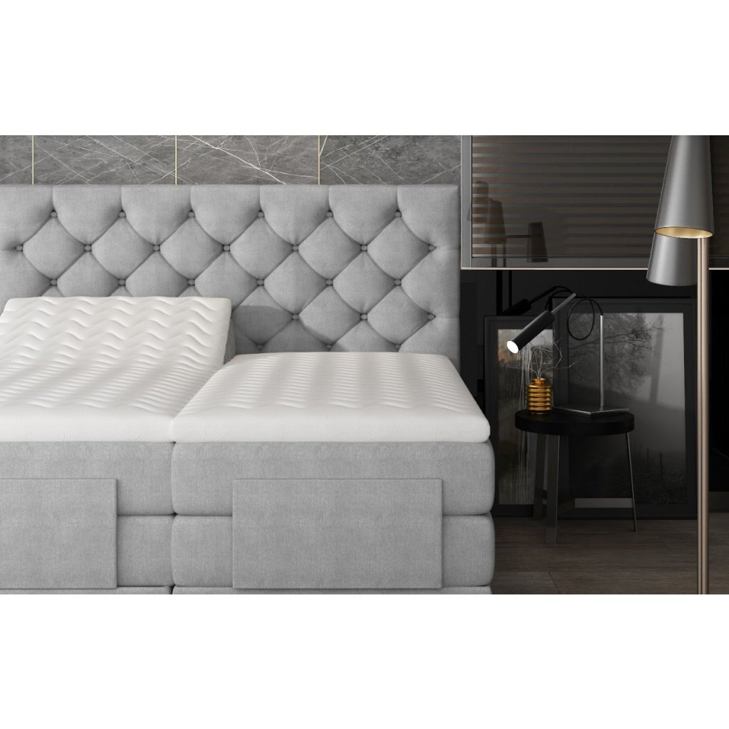 Az ellenállhatatlan BOXSPRING ágy kiváló minőségű anyagokból készült. A CLOVER dupla állítható ágy képes a matracok magasságának, valamint a fej- és lábmagasságnak az állítására. Az ágy mindkét oldalán található két távirányítónak köszönhetően minden matracot külön-külön is beállíthat. A CLOVER ágy három különálló matraccal van felszerelve, amelyek együttesen tágas alvóhelyet hoznak létre magasan a padló felett, ami megkönnyíti a mindennapi felkelést. A gyönyörűen steppelt fejtámla véd a falak hidegétől, és nagyon esztétikusnak tűnik.