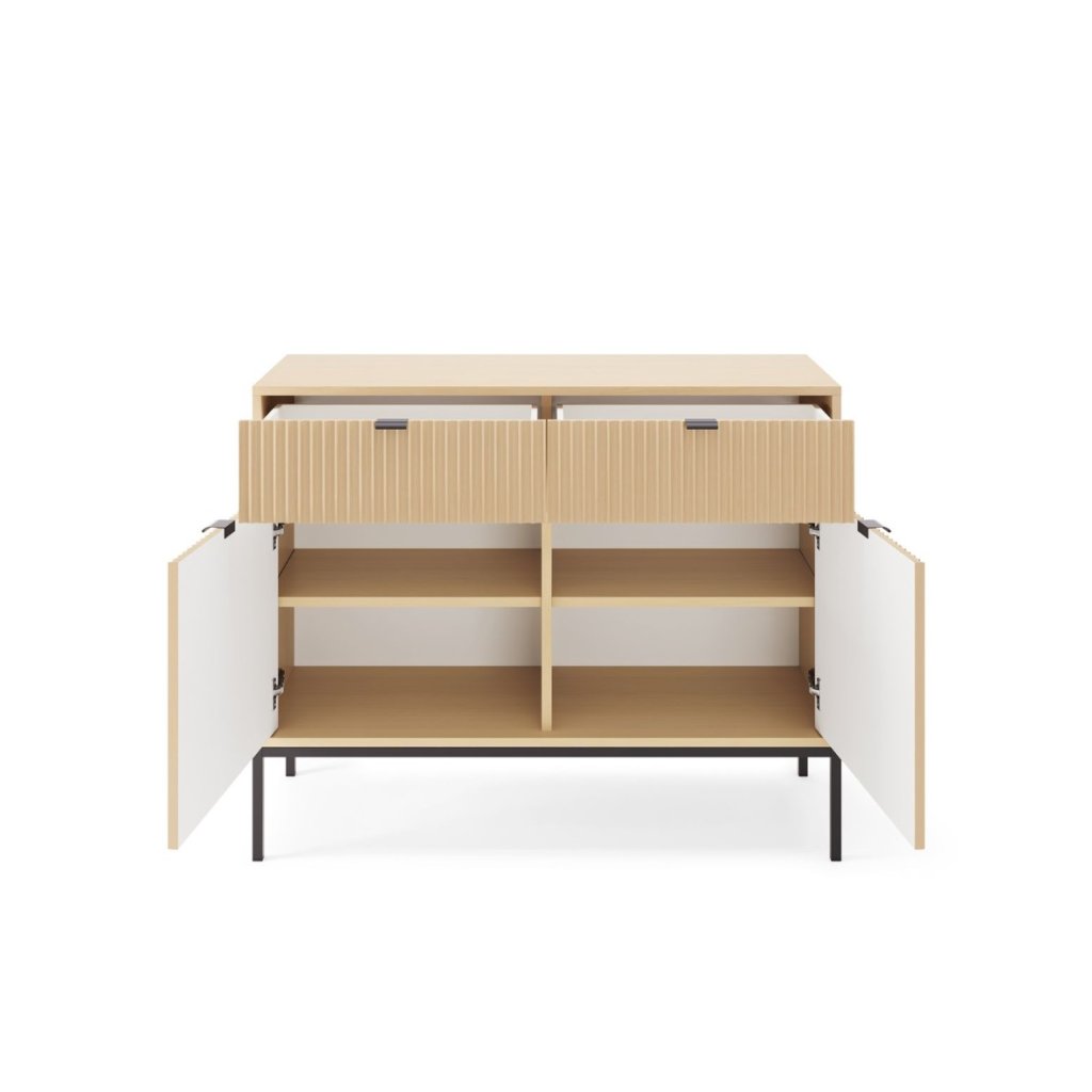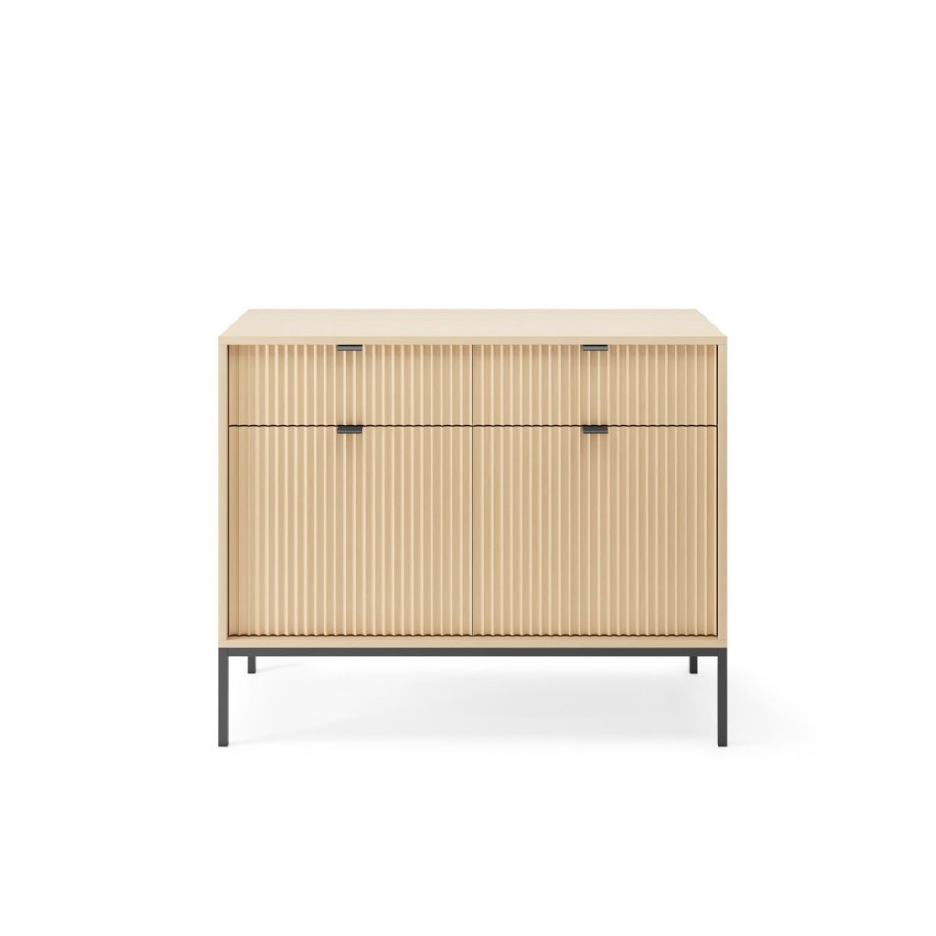 A MONA KSZ-104 fiókos szekrény 16 mm-es laminált vázzal és 18 mm-es MDF ajtókkal rendelkezik. A fiókos szekrényt visszafogott, arany színű fogantyúk teszik teljessé. Lenyűgöző kontrasztot alkotnak a porszórt acélból készült fekete lábak . A bútor ABS élekkel rendelkezik . Tisztítása egyszerű és gyors - csak használjon nedves ruhát vagy megfelelő bútortisztítót.
