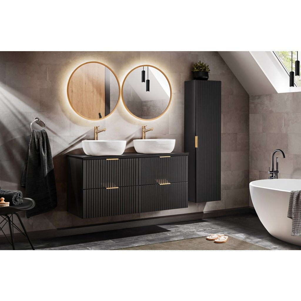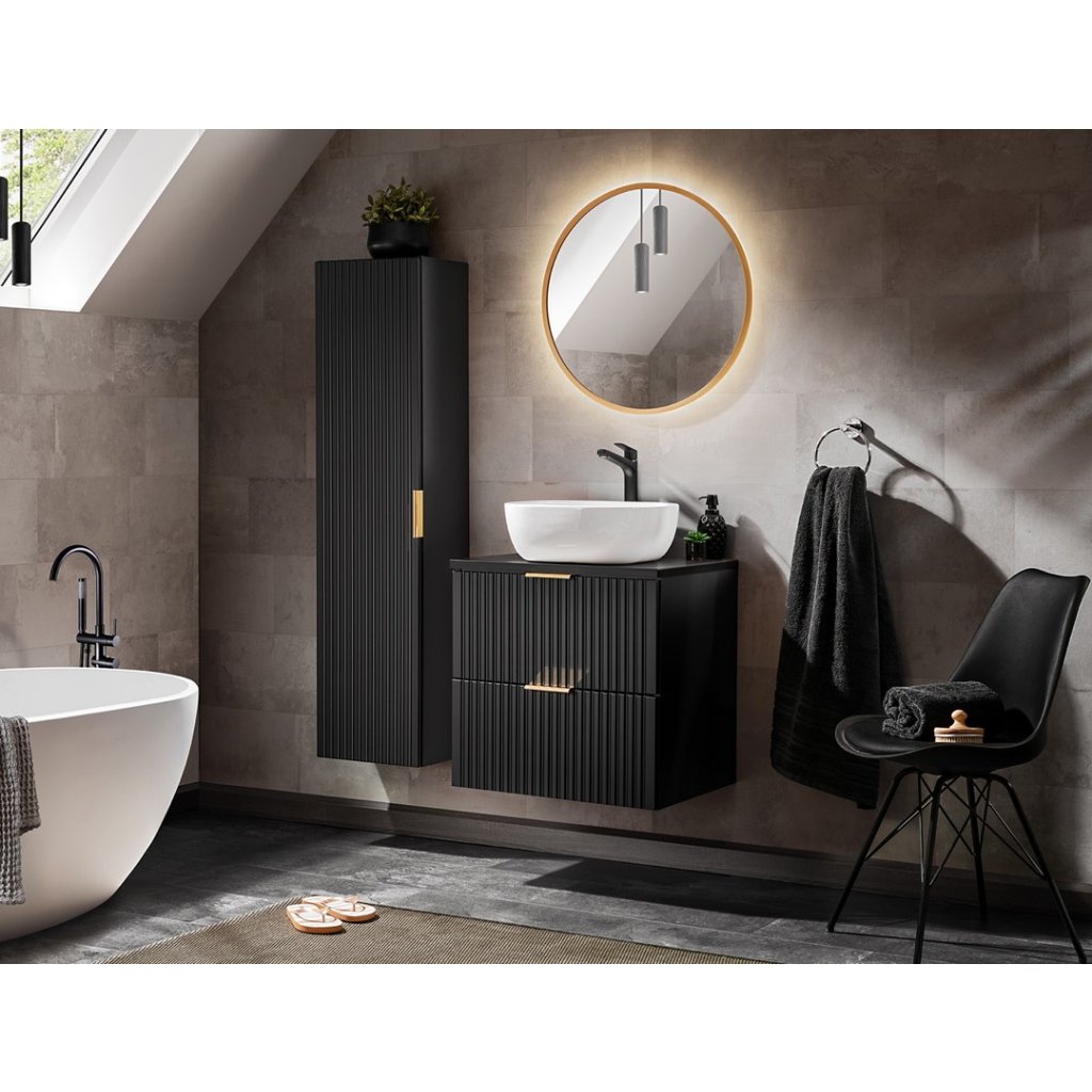 A tökéletes fürdőszobai szett Az ADEL Black in Black ideális választás mind a modern, mind a klasszikus fürdőszobákba , magas funkcionalitása pedig még a legigényesebb felhasználók kényelmét is biztosítja. Az ADEL Black 81-40 mosdószekrény egy ajtóval, lágyan záródó mechanizmussal és kosárral rendelkezik. A minimalista dizájnt függőlegesen barázdált előlapok élénkítik , amelyek modernek és keresettek. További előny a fogantyúk színének megválasztása, mivel minden szekrény három színű fogantyúval kapható : aranyfényű, krómfényű és matt fekete. Ennek köszönhetően a fogantyúk színe összehangolható a szerelvényekkel, különböző keretszínű tükrökkel, vagy a bútorok megjelenését is felfrissíthetjük a jövőben.
