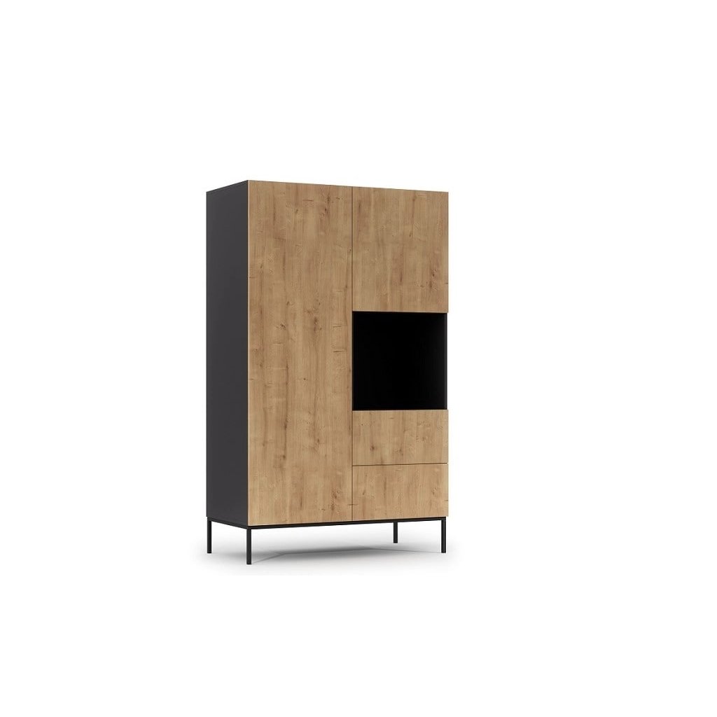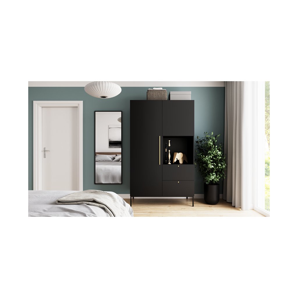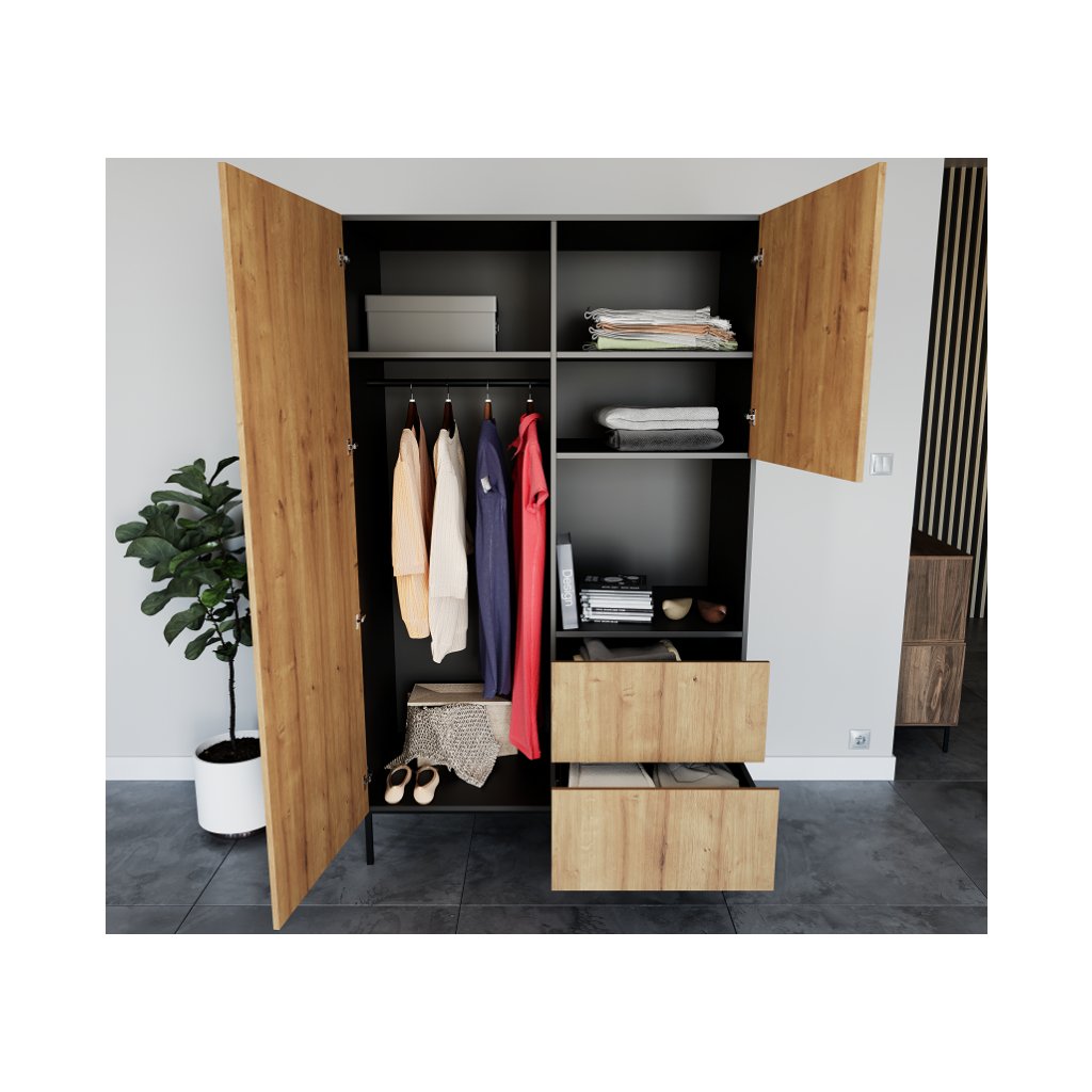 A bájos LANZZI bútorkollekció könnyen összeszerelhető, szemet gyönyörködtető és funkcionális. Ha szereti az elegáns kortárs stílust, ez a bútor minden elvárásának megfelel. Nem számít, hogy a feketét vagy a tölgyfa természetesebb kombinációját kedveli. A LANZZI kollekció két változatban kapható, így mindenki megtalálja a kedvére valót. Az egyenes szettak és a magas fekete fém lábak bármilyen hálószobába, nappaliba vagy előszobába illenek. Az arany fogantyúk egyfajta csillogó hatást kölcsönöznek a bútoroknak. A Lanzzi gardrób két fiókkal, három zárt és egy nyitott polccal kombinált, az akasztó rúd pedig kedvenc ruháinak, kabátjainak vagy kosztümjeinek tárolására szolgál. A LANZZI gardrób rugalmas tárolóhelyet biztosít. A fiókok hangtalan nyitással vannak felszerelve.