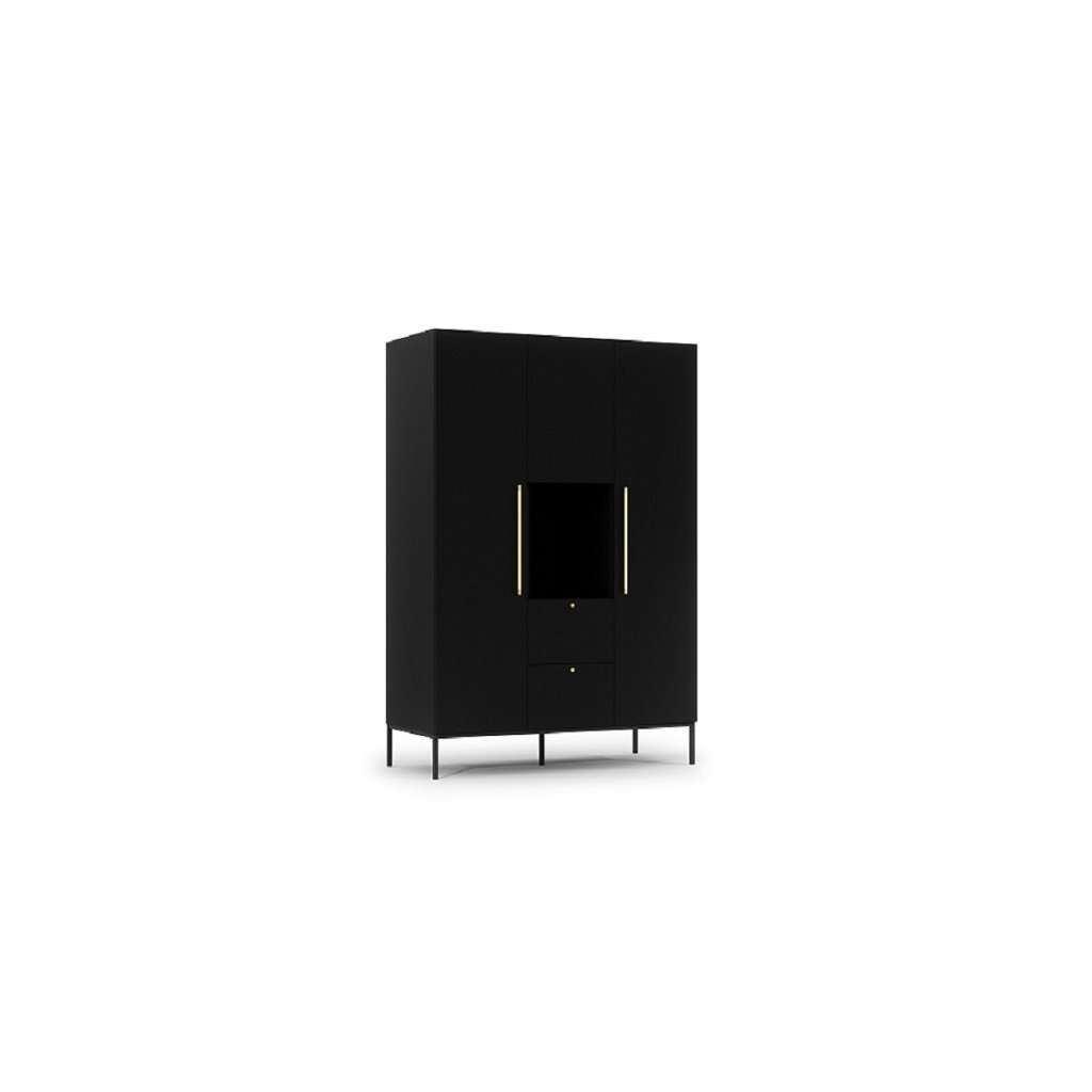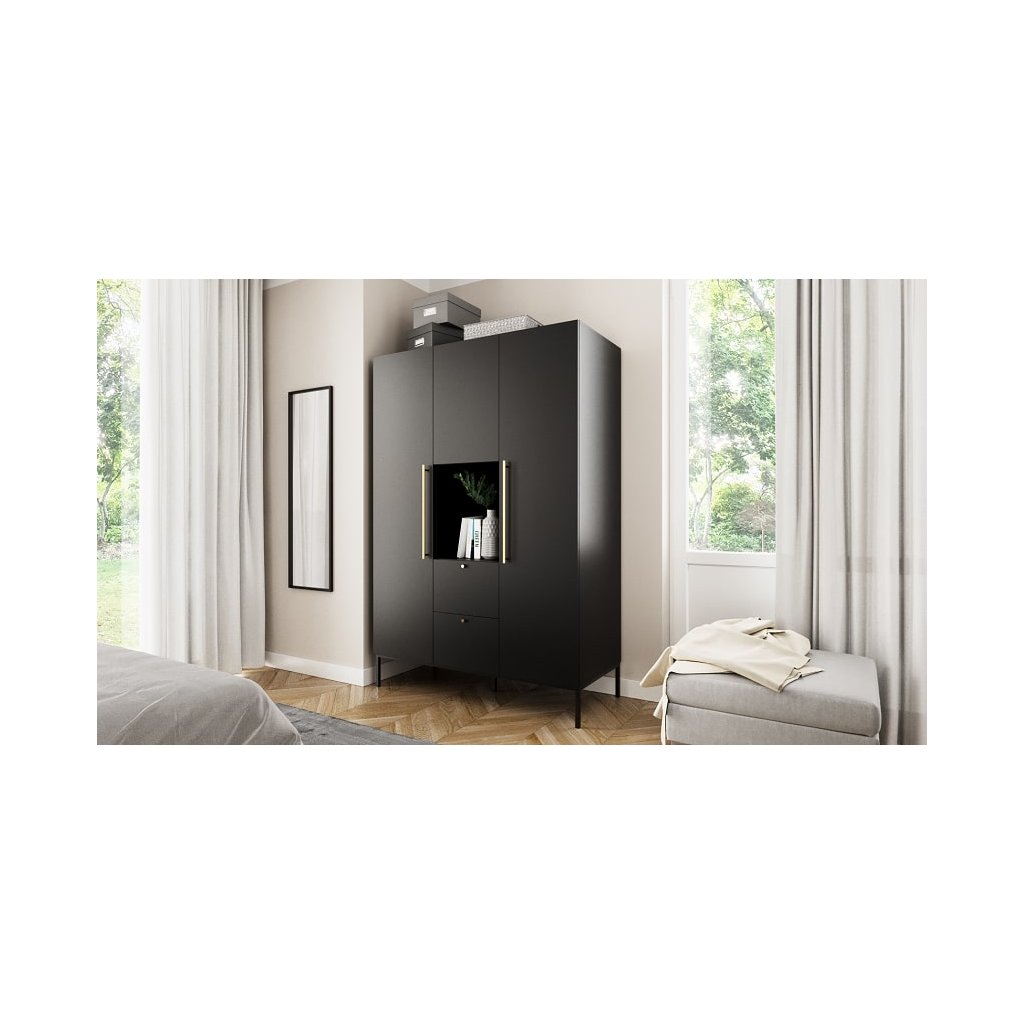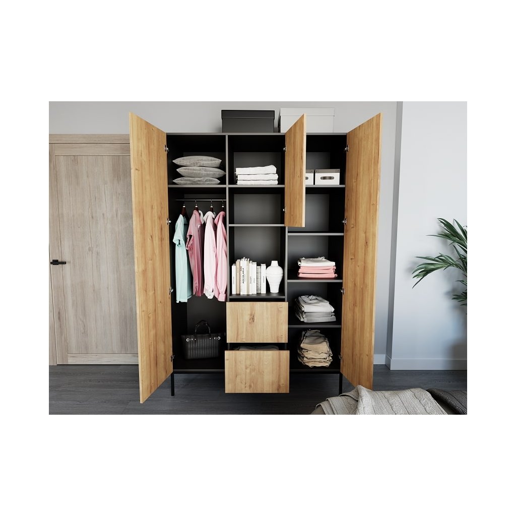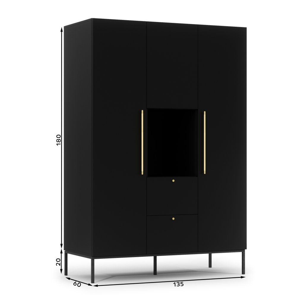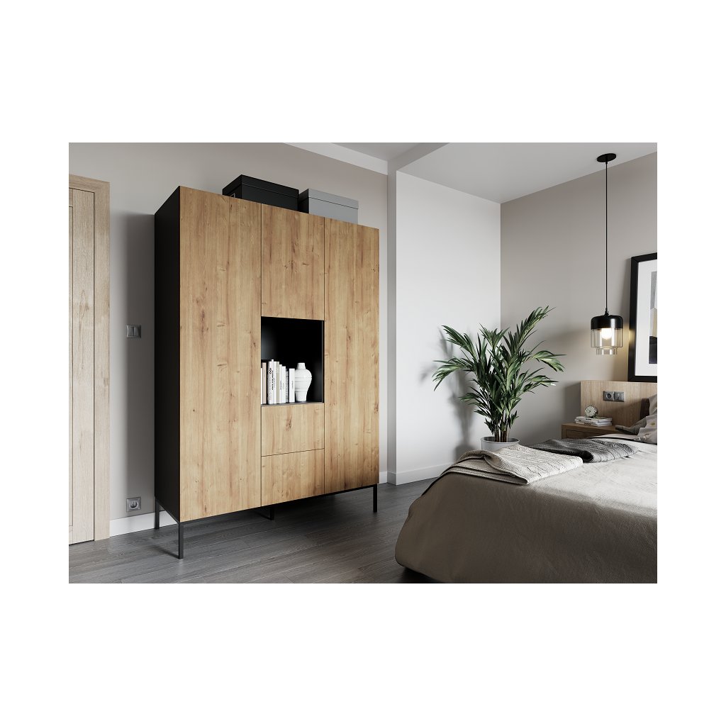 A bájos LANZZI bútorkollekció könnyen összeszerelhető, szemet gyönyörködtető és funkcionális. Ha kedveled az elegáns kortárs stílust, ez a bútor minden elvárásodnak megfelel. Nem számít, hogy a feketét vagy a természetesebb tölgyfa kombinációt kedveled, a LANZZI kollekció két változatban kapható, így mindenki megtalálhatja a kedvére valót. Az egyenes szettak és a magas fekete fém lábak bármilyen hálószobába, nappaliba vagy előszobába illenek. Az arany fogantyúk egyfajta csillogó hatást kölcsönöznek a bútoroknak. A LANZZI gardrób két fiókkal, nyolc zárt és egy nyitott polccal kombinált, az akasztó rúd pedig kedvenc ruháid, kabátjaid vagy kosztümöid tárolására szolgál. A LANZZI 135 gardrób rugalmas tárolási lehetőséget kínál. A fiókok hangtalan nyitással vannak felszerelve. Fogantyúval vagy fogantyú nélkül is választható.