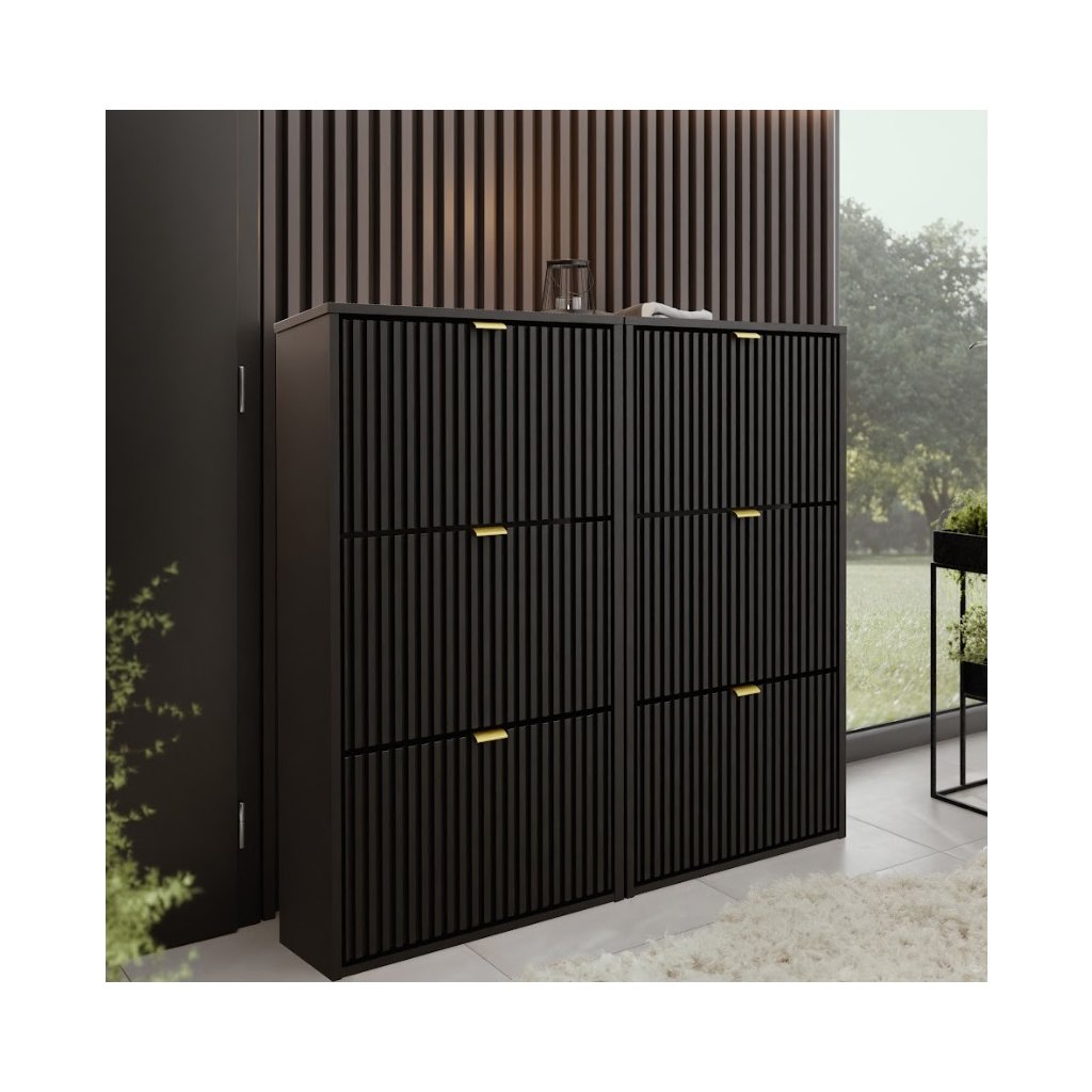 A LARO 2 cipőszekrény fekete színben készült, amely tökéletesen illeszkedik a modern enteriőrökbe . A bútor minimalista jellegét elegáns fogantyúk hangsúlyozzák . Az elülső bordázott felületek egyedi és stílusos megjelenést kölcsönöznek a cipőszekrénynek . Tágas kialakításának és csuklós ajtóinak köszönhetően kényelmes és praktikus megoldást kínál a cipők tárolására.