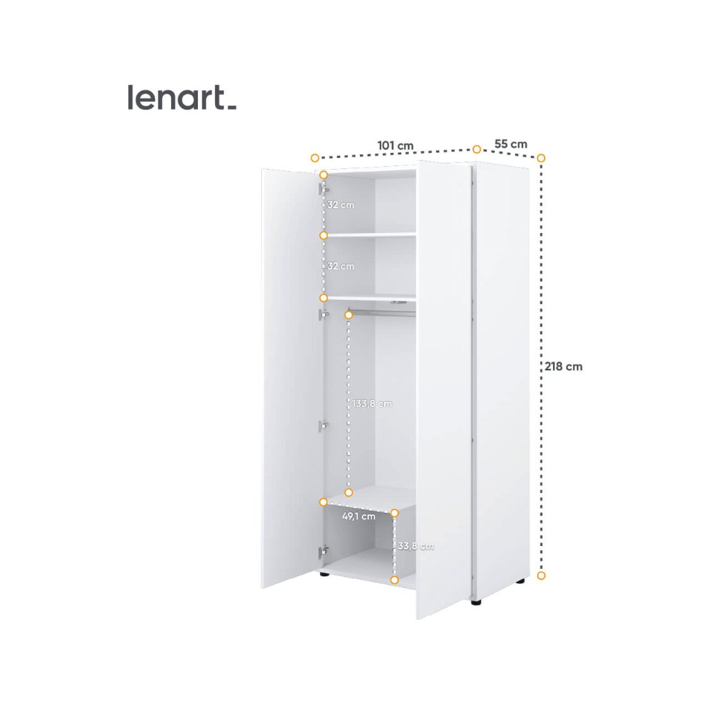 A modern, kétajtós Lenart BED CONCEPT BC-20 gardróbszekrény azoknak ajánlott, akik kiváló minőségű és időtálló bútorokat keresnek otthonukba. A nyomásra nyíló rendszernek köszönhetően könnyen nyitható. A gardróbszekrény vállfával és polcokkal rendelkezik, amelyek elegendő helyet biztosítanak a ruhák tárolására. Az alsó részben például kézitáskák tárolására van hely. Az ABS éleknek köszönhetően megakadályozzuk a sarkok kopását. Az időtlen gardróbszekrény nagyszerű megoldás kis terekbe, más Lenart BED CONCEPT bútorokkal együtt.