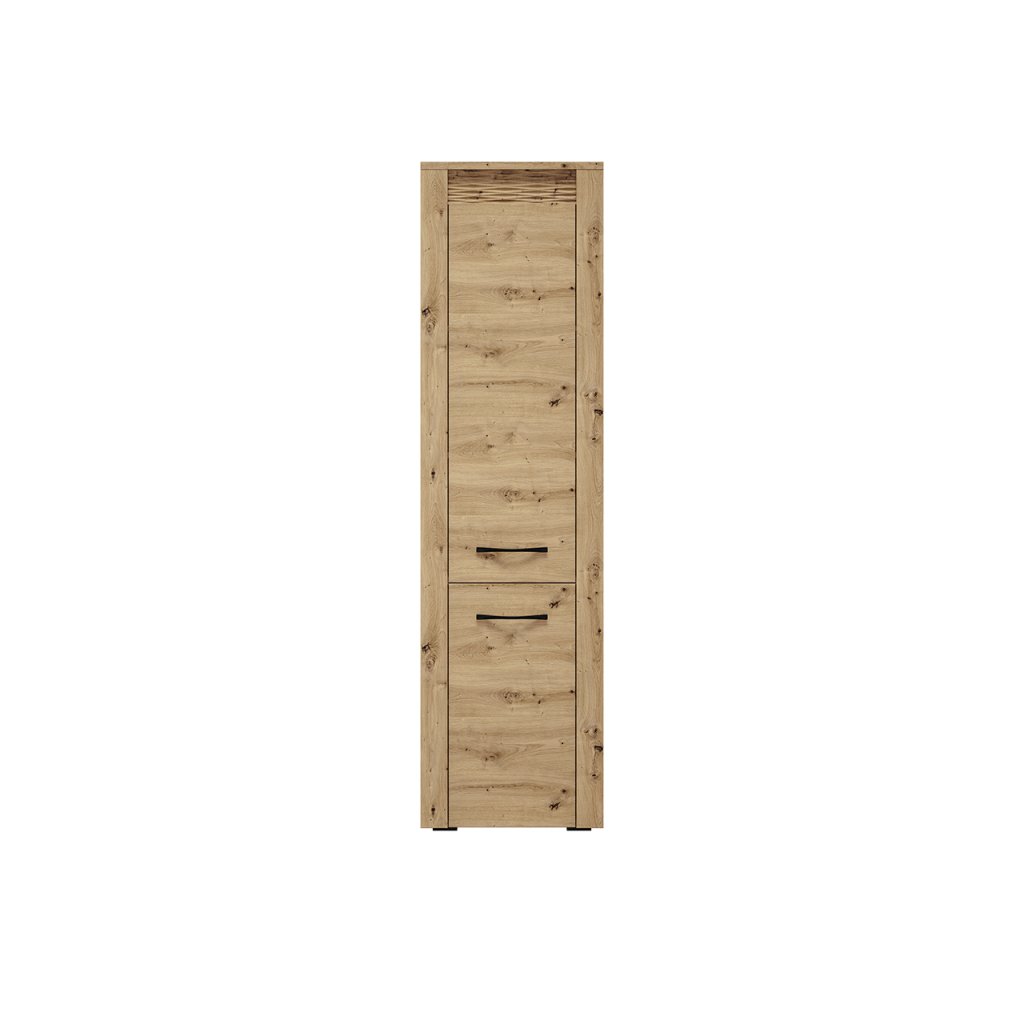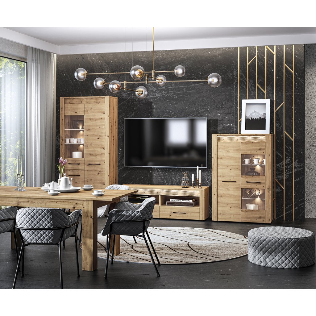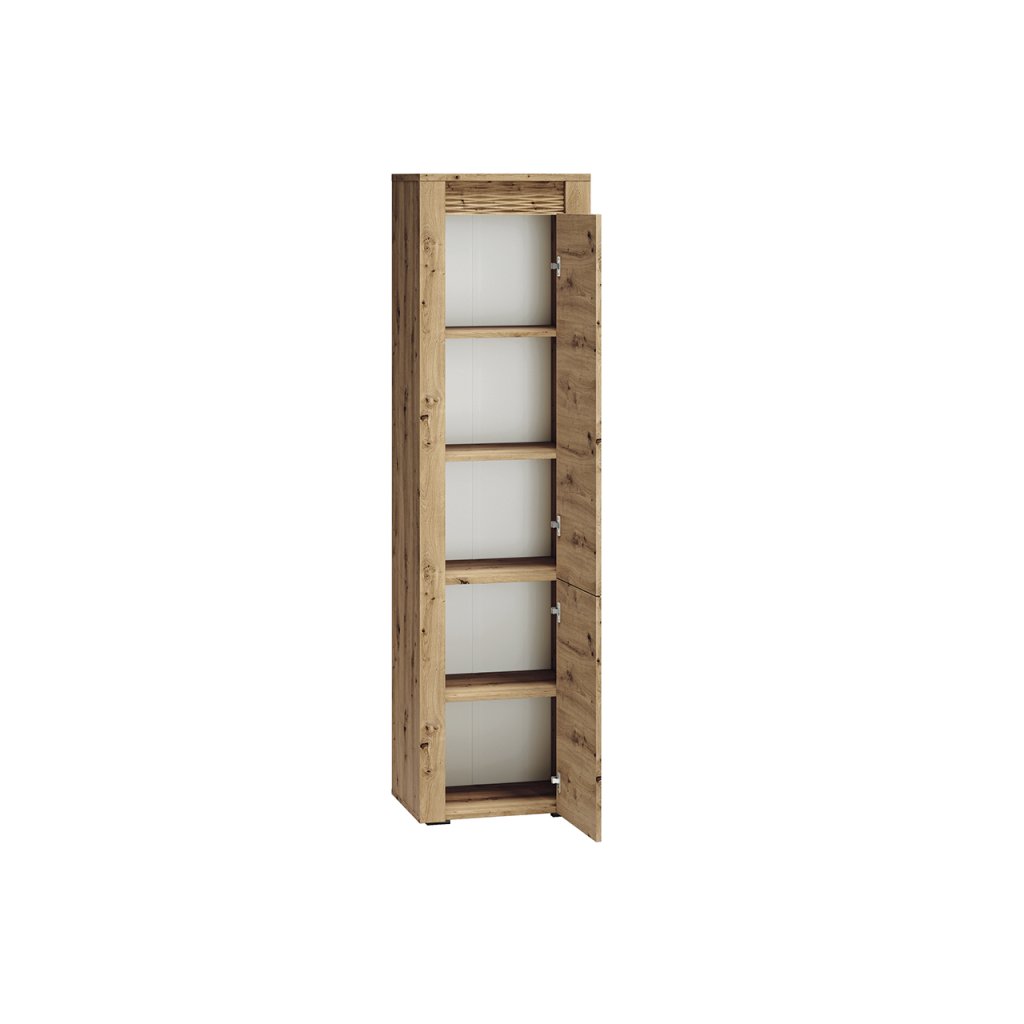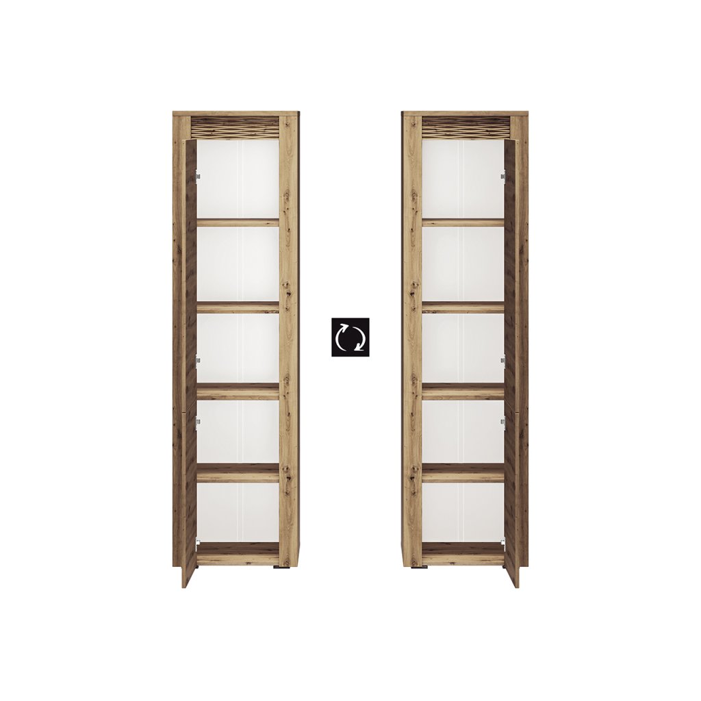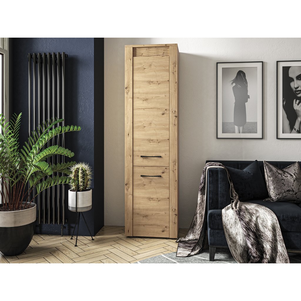 A LEWIS kollekció jelentős és impozáns stílusa modern, de különösen klasszikus enteriőrbe illik. A tölgy kézműves dekor natúr fa erezete fekete fogantyúkkal kombinálva élénkíti a helyiséget, a megvilágított dekoratív horony pedig már első pillantásra megragadja a tekintetet. A LEWIS 02 szekrény egy kétajtós polcos szekrény, a mindennapi használat során értékelni fogja az ABS éleket . Az ajtó bal és jobb oldalra is felszerelhető. Ne habozzon, és bútorozza nappaliját vagy étkezőjét a LEWIS kollekcióval .