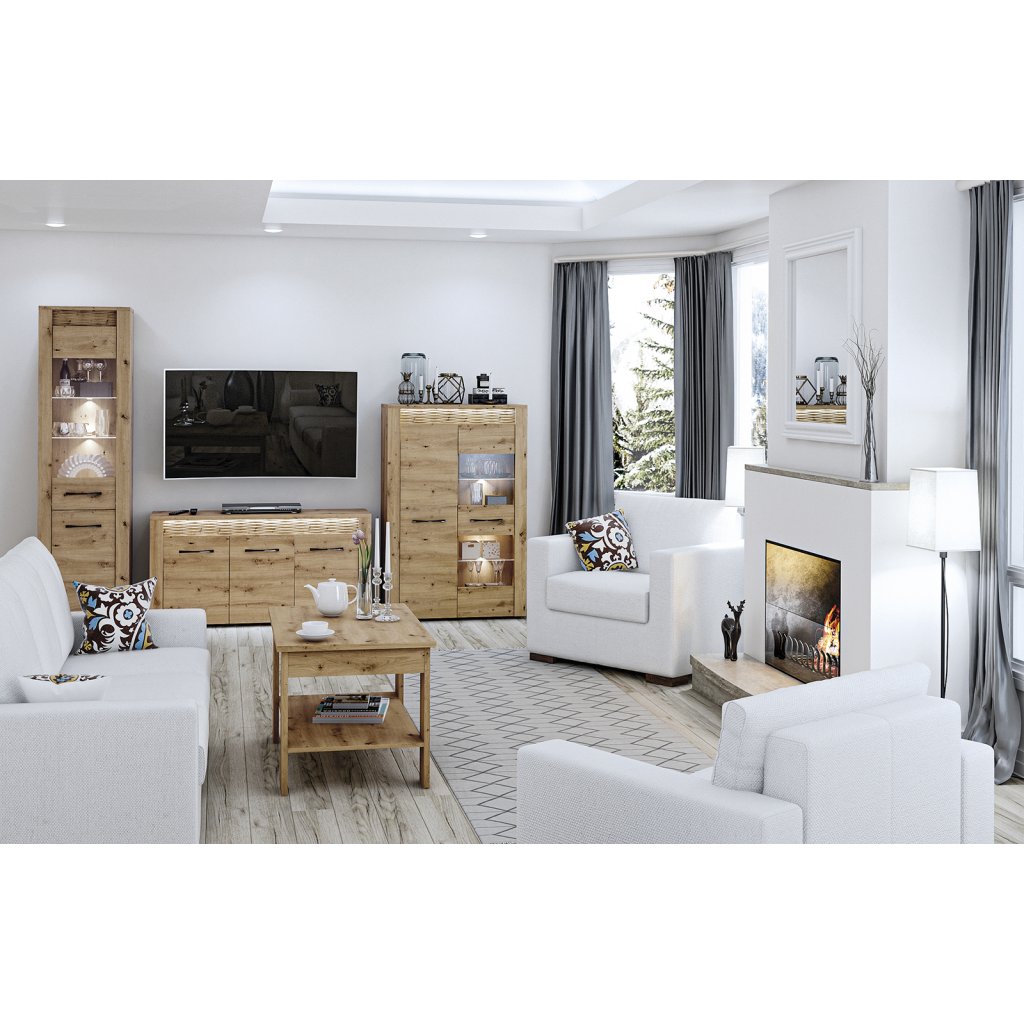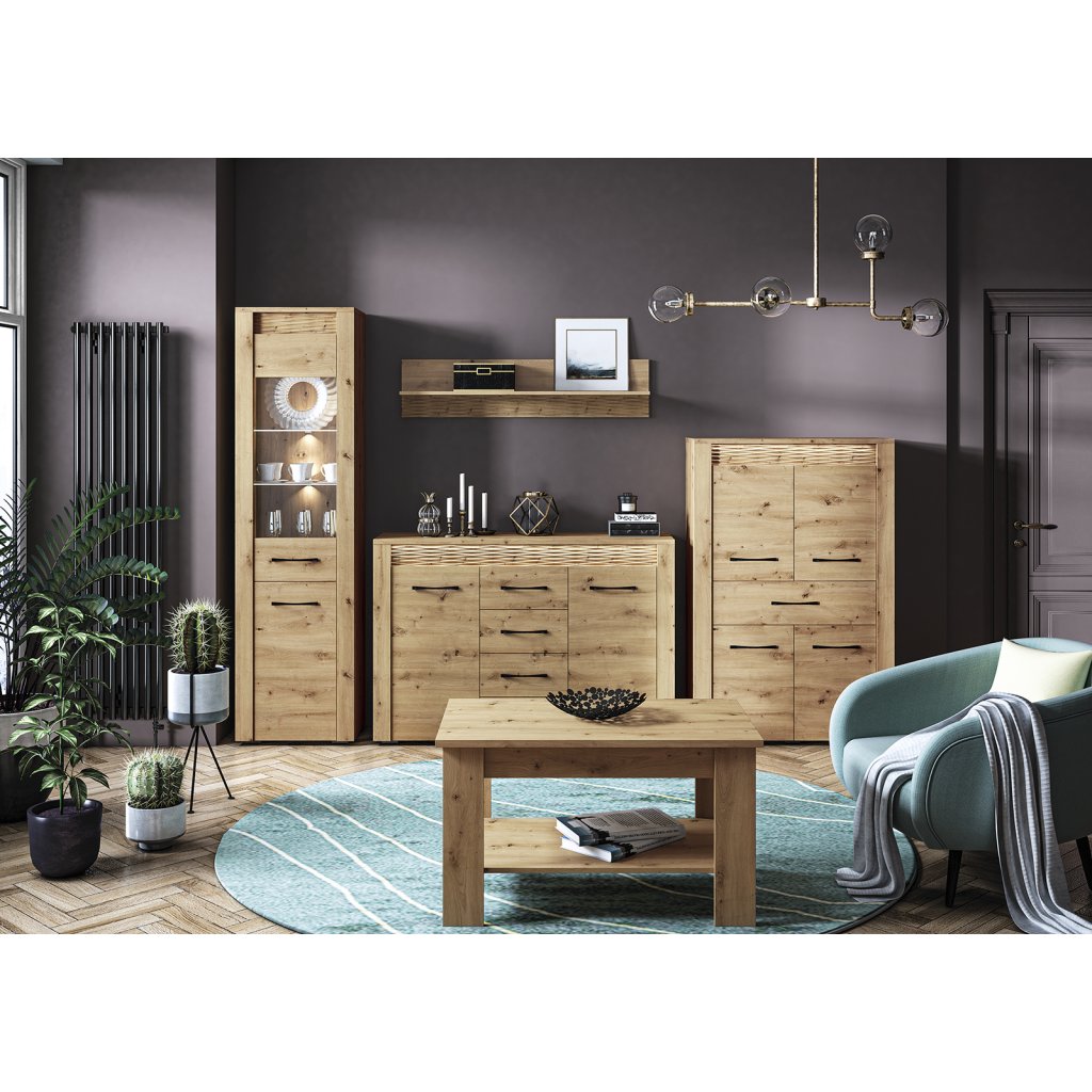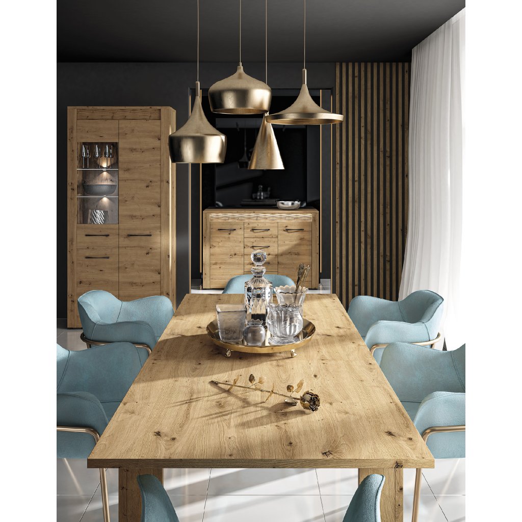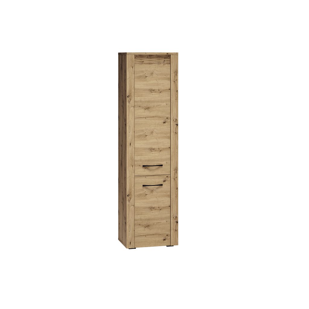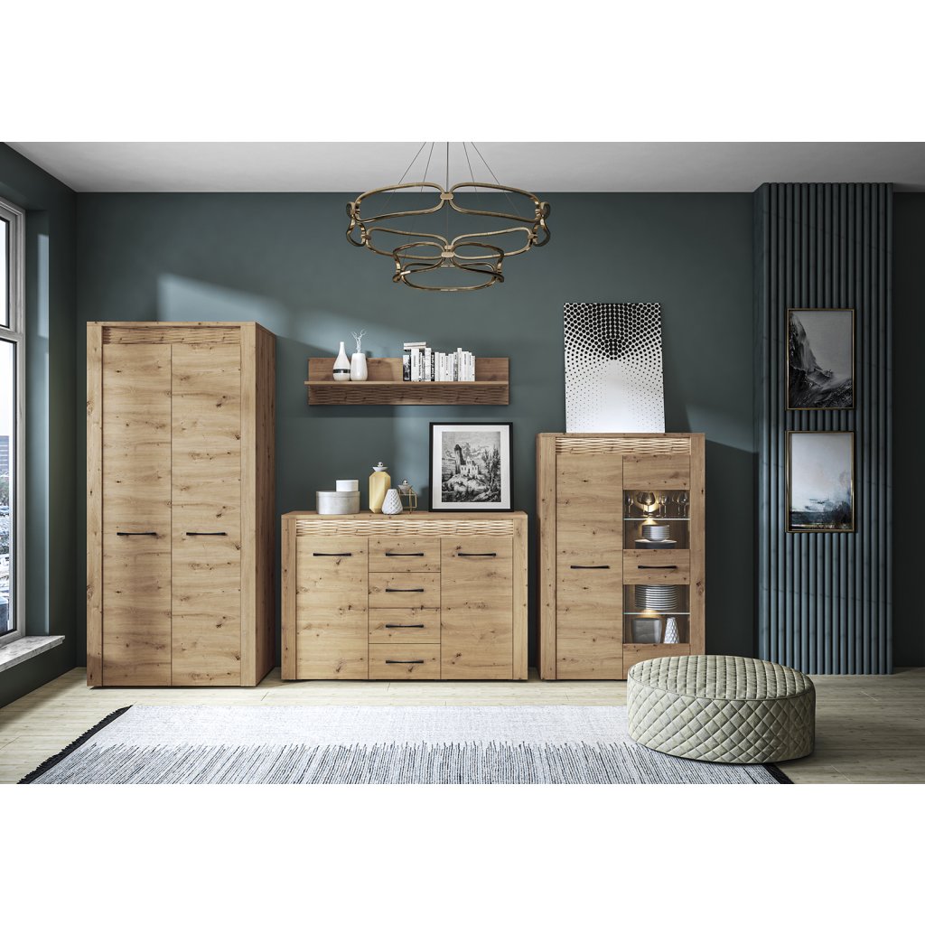 A LEWIS kollekció jelentős és impozáns stílusa modern, de különösen klasszikus enteriőrbe illik. A tölgy kézműves dekor natúr fa erezete fekete fogantyúkkal kombinálva élénkíti a helyiséget, a megvilágított dekoratív horony pedig már első pillantásra megragadja a tekintetet. A LEWIS 02 szekrény egy kétajtós polcos szekrény, a mindennapi használat során értékelni fogja az ABS éleket . Az ajtó bal és jobb oldalra is felszerelhető. Ne habozzon, és bútorozza nappaliját vagy étkezőjét a LEWIS kollekcióval .