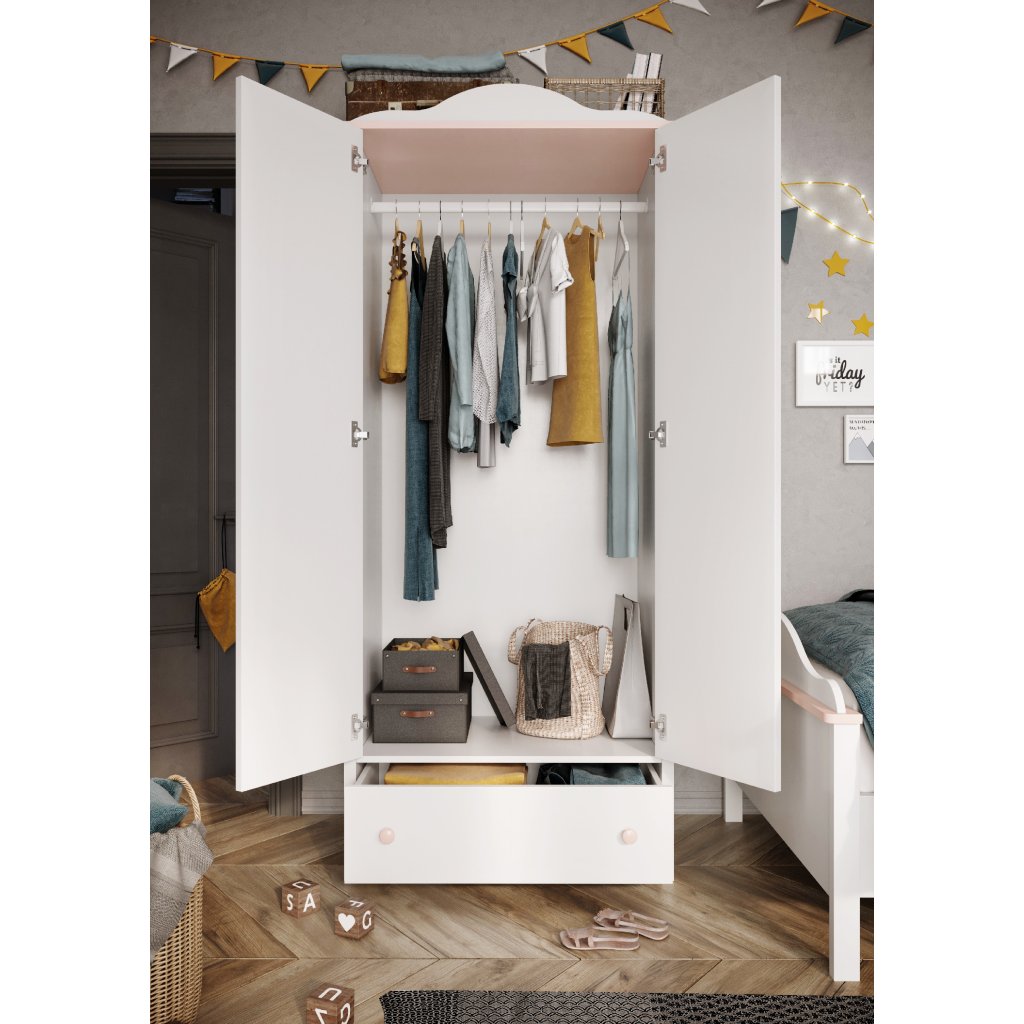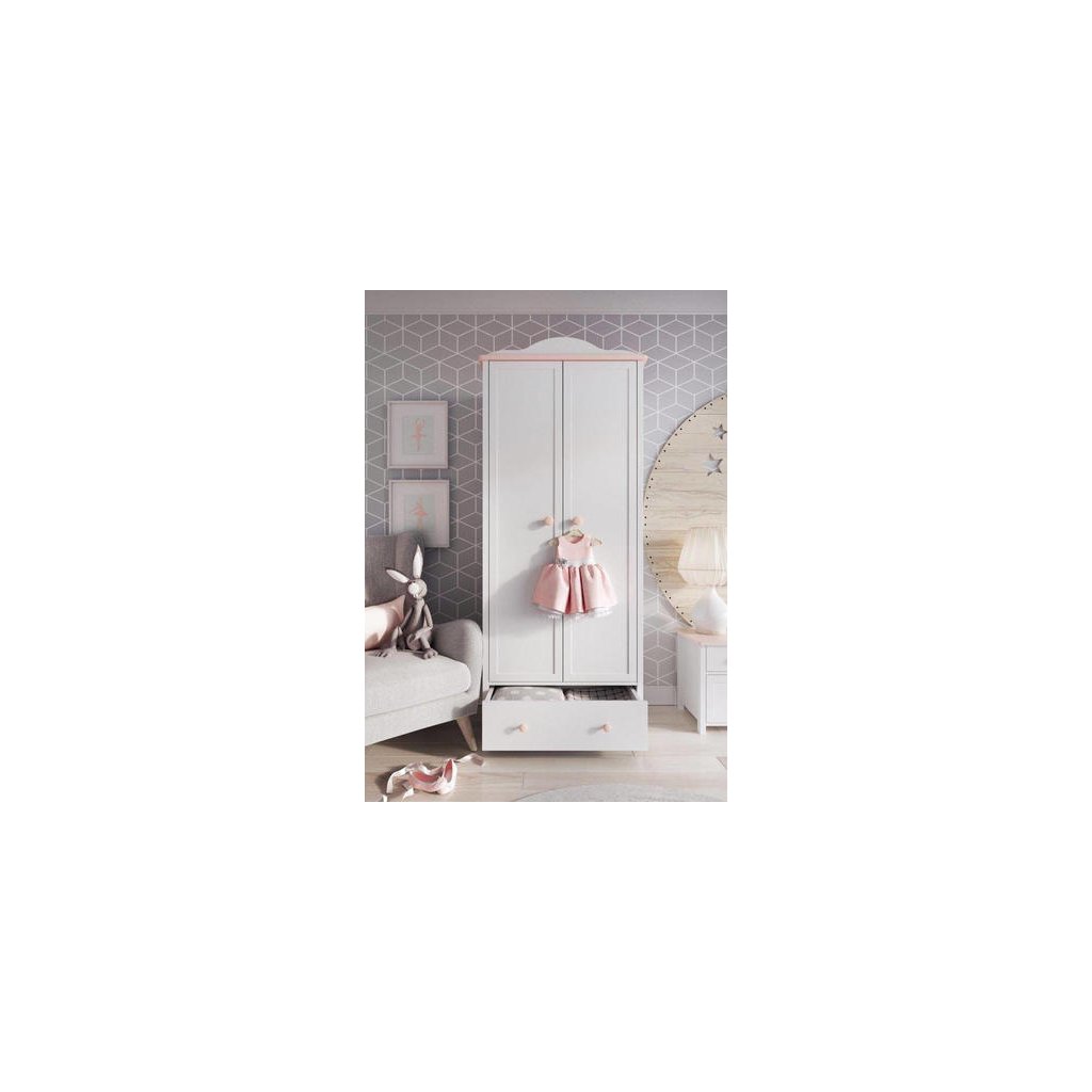 Az egyedi LUNYS NL-01 2D gardróbszekrény különösen alkalmas gyerekszobák berendezésére, amit különösen a lányok értékelni fognak. A gardróbszekrény fehér és rózsaszín kombinációjában készült, ami végső soron nagyon kellemes kontrasztot teremt. A LUNYS gyerekbútor kollekció kiváló minőségű anyagokból készült, így ellenáll a víznek és a mechanikai sérüléseknek. A gardróbszekrény kétajtós, fiókos. A LUNYS kollekciót úgy tervezték, hogy a praktikumot a gyönyörű és modern dizájnnal ötvözze.