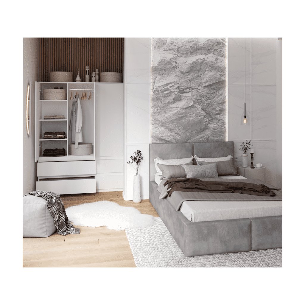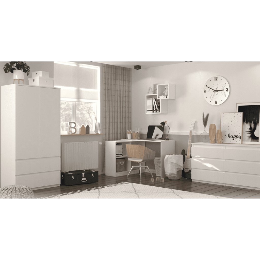 A fehér gyerekszoba a tisztaság, az elegáns stílus és az időtlenség szimbóluma. A fehér nemcsak vizuálisan növeli a teret , hanem ideális környezetet teremt a gyermekek kreativitásához és a nyugodt alváshoz is . A tágas, kétajtós MAIKII ruhásszekrény 3 polcot és egy ruhaakasztó stiftet rejt, valamint két széles fiókkal rendelkezik. A fehér színnek köszönhetően tökéletesen illeszkedik bármilyen enteriőrbe , ugyanakkor elegendő tárolóhelyet biztosít ruhák, játékok vagy más fontos dolgok számára.