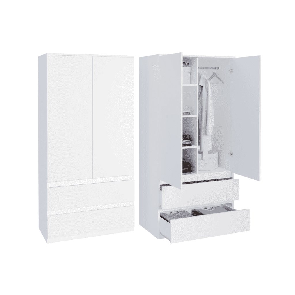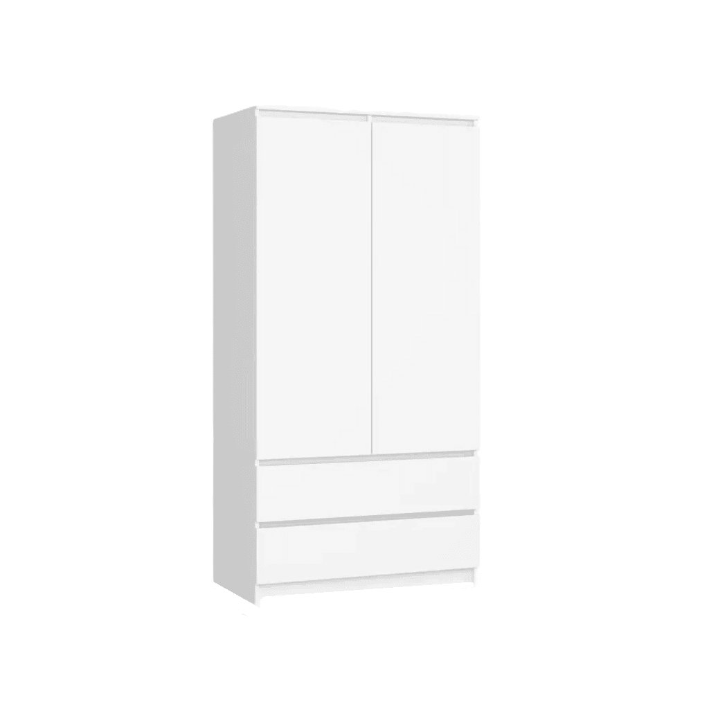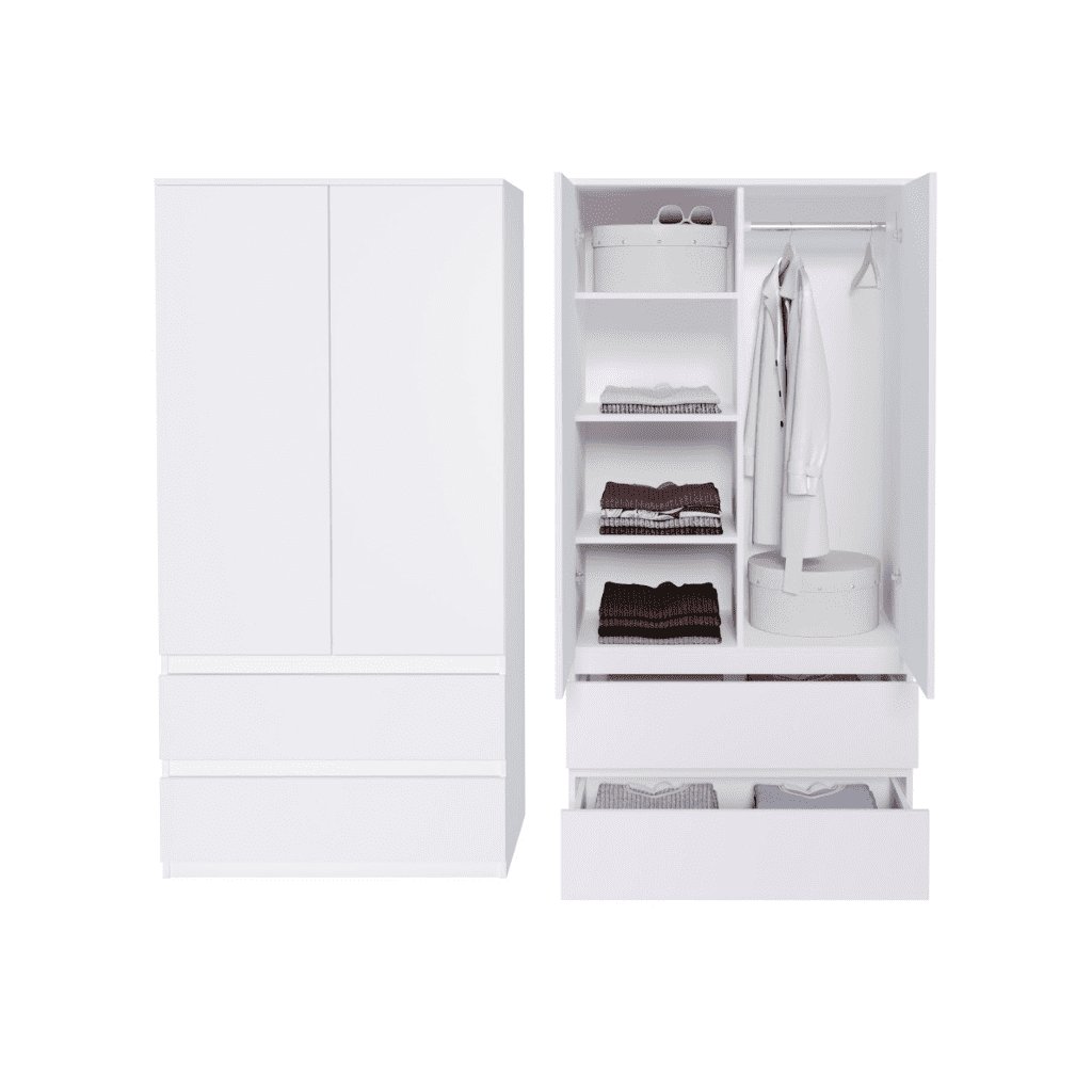 A MAIKII ruhásszekrény kiváló minőségű, 16 mm-es laminált anyagból készült, ABS élekkel. Az anyag karbantartásmentes, a por és az ujjlenyomatok nedves ruhával letörölhetők.