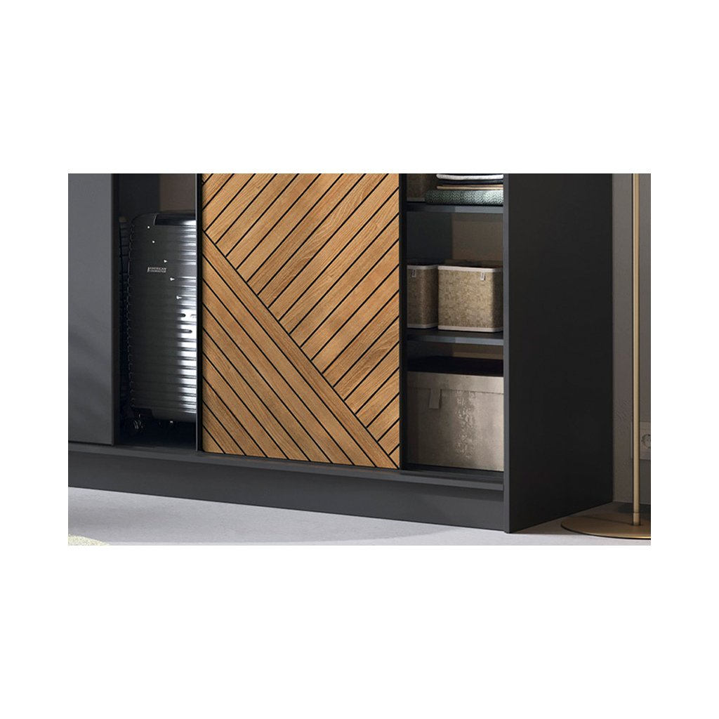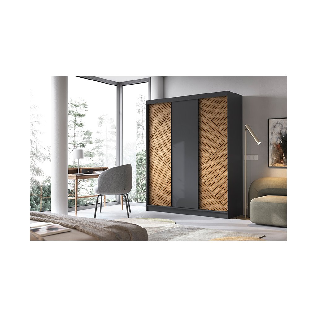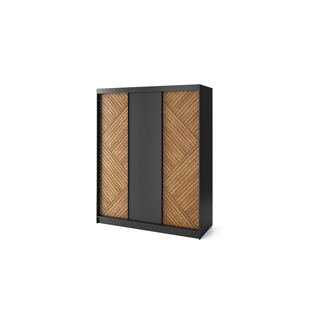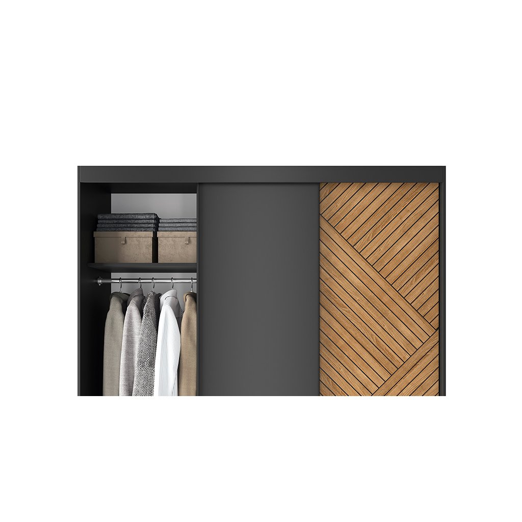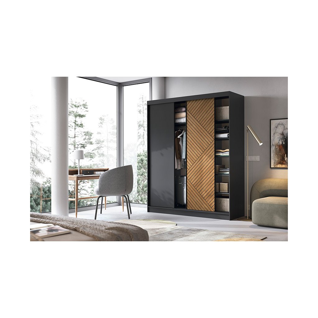 A Marrphy III 180 gardróbszekrény | tükör nélkül, kétajtós, tolóajtós gardróbszekrény az elegancia és a funkcionalitás kombinációja, amely forradalmasítja otthona rendszerezését. A kifinomult stílus és a fekete, valamint a karamell tölgy színek harmonikus kombinációja bármilyen enteriőrbe illik. Adja meg magának a megérdemelt teret és rendszerezést ezzel a lenyűgöző, tolóajtós Marrphy gardróbszekrénnyel .