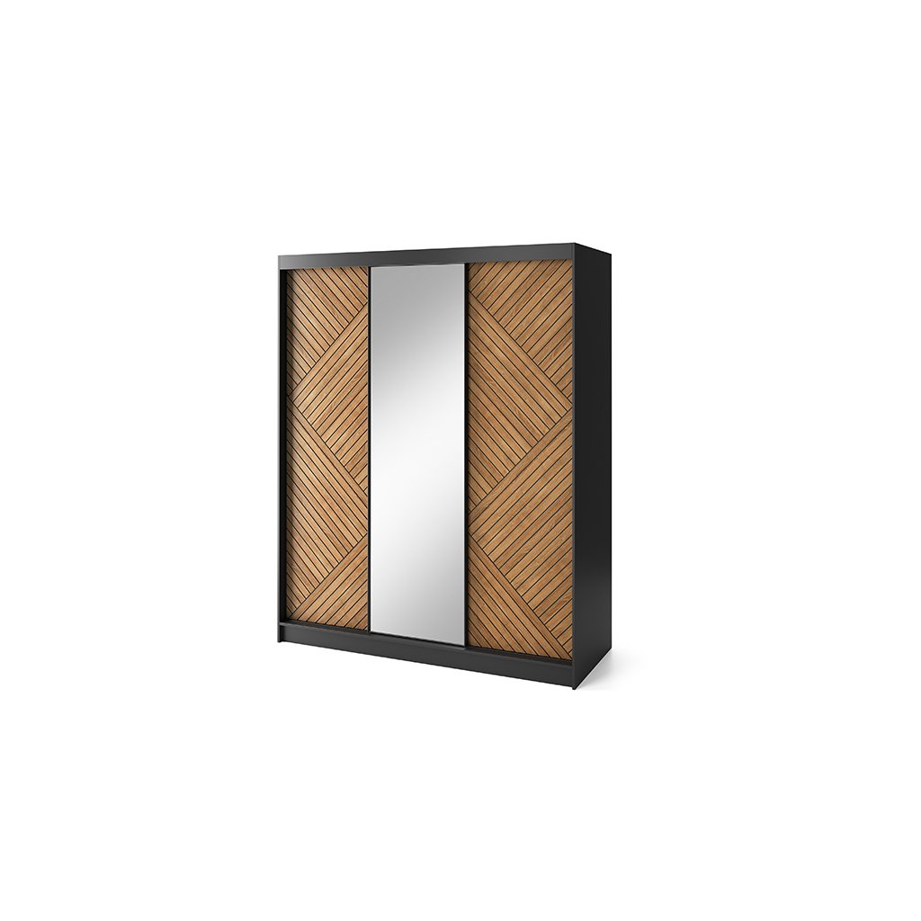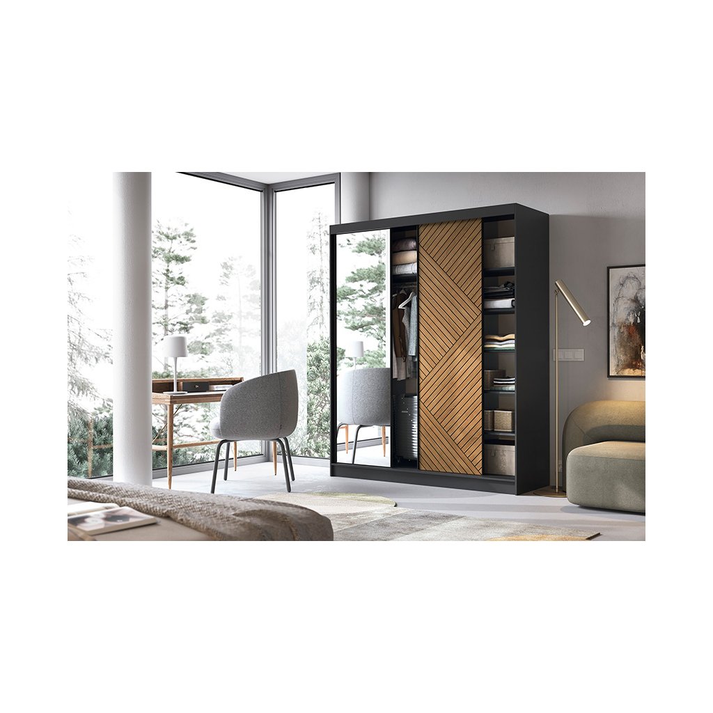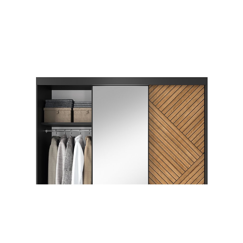 Marrphy III 180 gardróbszekrény | tükrös, kétajtós, tolóajtós gardróbszekrény, az elegancia és a funkcionalitás kombinációja, amely forradalmasítja otthona rendszerezését. Rengeteg tárolóhely a 6 polcnak köszönhetően, amelyek maximális teherbírása 10 kg, valamint a praktikus vállfa rúdnak köszönhetően, amely egyenesen tartja a ruhákat és nem gyűrődik. A kifinomult stílus és a fekete, valamint a karamell tölgy színek harmonikus kombinációja bármilyen enteriőrbe illik. Adja meg magának a megérdemelt teret és rendszerezést ezzel a lenyűgöző , tolóajtós, tükörrel ellátott Marrphy gardróbszekrényel .
