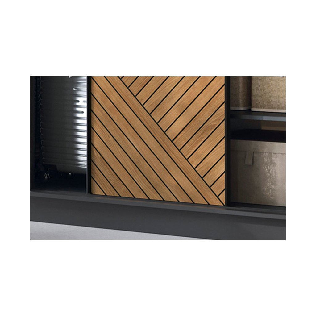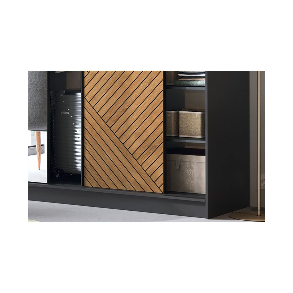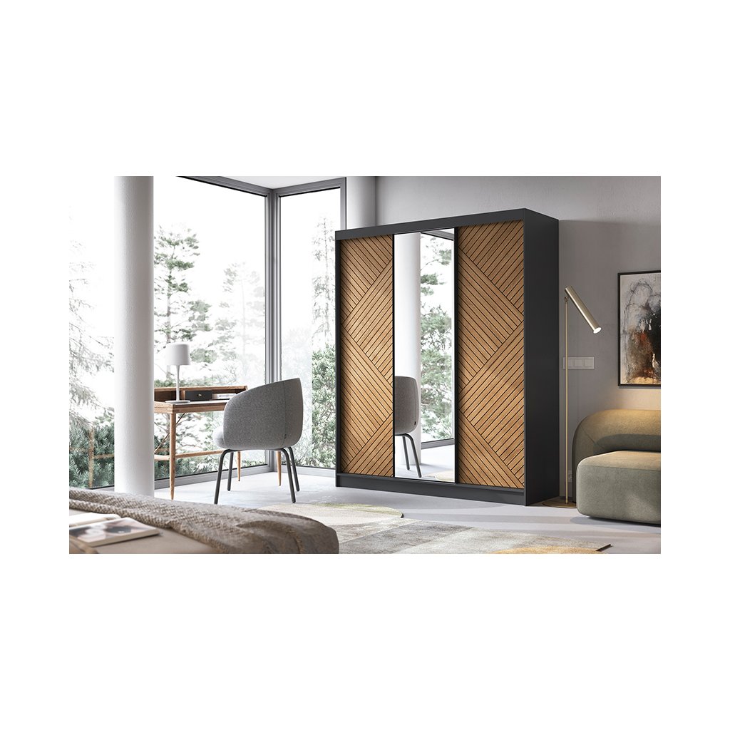 Marrphy III 180 gardróbszekrény | tükrös, kétajtós, tolóajtós gardróbszekrény, az elegancia és a funkcionalitás kombinációja, amely forradalmasítja otthona rendszerezését. Rengeteg tárolóhely a 6 polcnak köszönhetően, amelyek maximális teherbírása 10 kg, valamint a praktikus vállfa rúdnak köszönhetően, amely egyenesen tartja a ruhákat és nem gyűrődik. A kifinomult stílus és a fekete, valamint a karamell tölgy színek harmonikus kombinációja bármilyen enteriőrbe illik. Adja meg magának a megérdemelt teret és rendszerezést ezzel a lenyűgöző , tolóajtós, tükörrel ellátott Marrphy gardróbszekrényel .