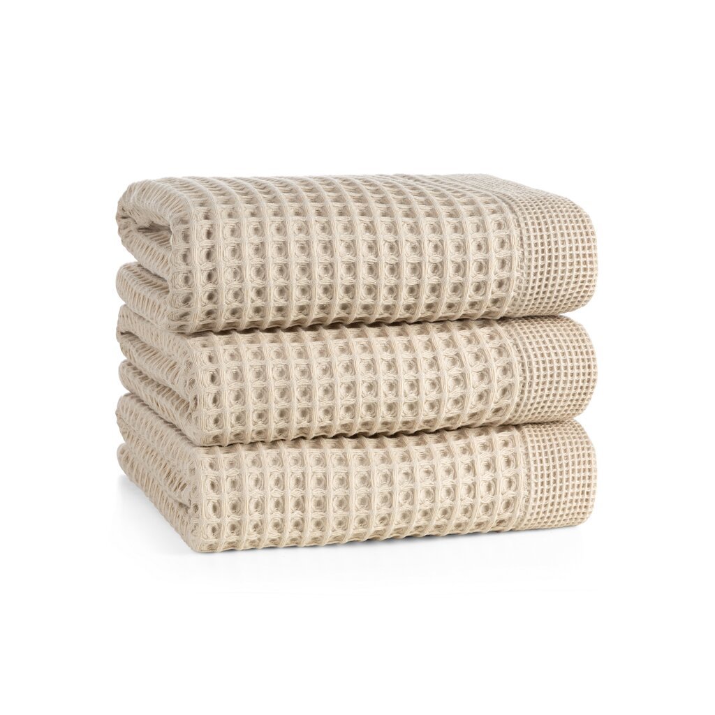 Pamut fürdőlepedő jellegzetes gofri mintázattal. Szélesség: 70 cm, Hosszúság: 140 cm, Szín: Bézs, Súly: 400 GSM, Összetétel: Anyag: 100% pamut