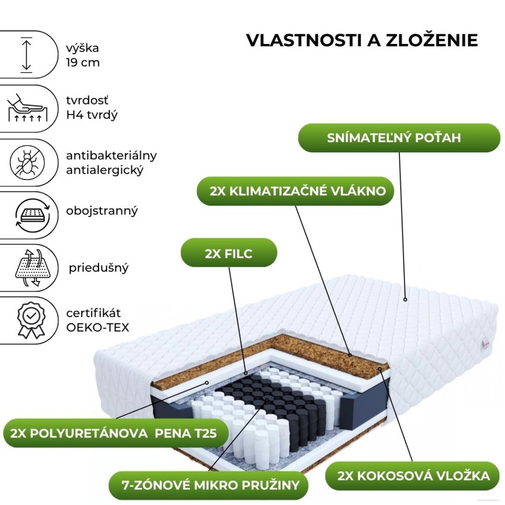 A matrac 7 zónás rugóval rendelkezik, jó légkeringéssel és antiallergén tulajdonságokkal. A zsák betétet T25 poliuretán hab veszi körül, amely ellenáll a deformációnak. Mindkét oldalon kókusz betétet használtak, mely antiallergén tulajdonsága mellett erősíti a matrac felületét. A speciális szintetikus nem szőtt anyag állandó testhőmérsékletet biztosít, és egyben lehetővé teszi bőrünk lélegzését. Tanúsított és biztonságos anyagokból készült.