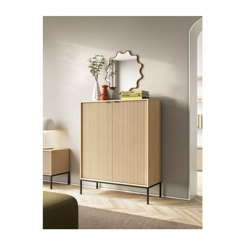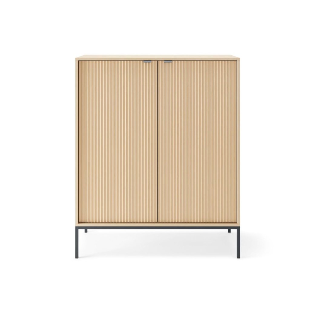 A MONA K-104 fiókos szekrény 16 mm-es laminált lapból, az ajtók pedig 18 mm-es MDF-ből készültek. A fiókos szekrényt visszafogott, arany színű fogantyúk teszik teljessé. Lenyűgöző kontrasztot alkotnak a porszórt acélból készült fekete lábak . A bútor ABS élekkel rendelkezik . Tisztítása egyszerű és gyors - csak használjon nedves ruhát vagy megfelelő bútortisztítót.