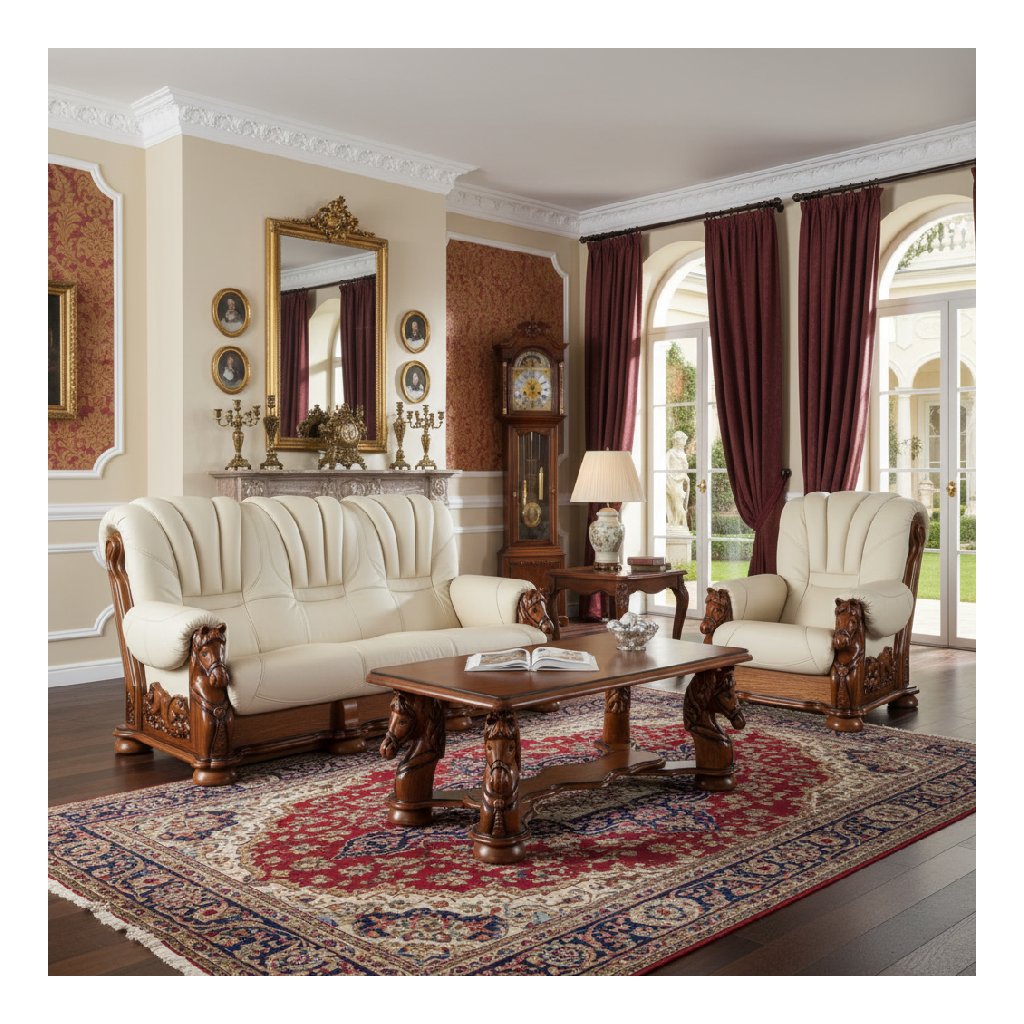 A luxus MUSTANG bőr ülőgarnitúra régies stílust kínál romantikus beütéssel. A garnitúrát az ülőlap oldalán tökéletesen faragott fa díszek jellemzik. A háttámlákon faragott lófejek láthatók, amelyek egyedi műalkotások. Ez a kihagyhatatlan kanapégarnitúra a klasszikus stílus kedvelőinek minden otthonában meghatározó elem lesz. A kanapégarnitúrának a masszív faragott lábak adják az összhatást. Többféle bőr közül választhat. Rendeléskor kérjük, a megjegyzésben jelezze a kívánt színváltozatot . A feltüntetett ár az alap árkategóriára vonatkozik , és a választott bőrtől függően változhat. A MUSTANG 3R+2+1 kanapégarnitúra ára egy 3 személyes , összecsukható ággyal ellátott kanapét tartalmaz.