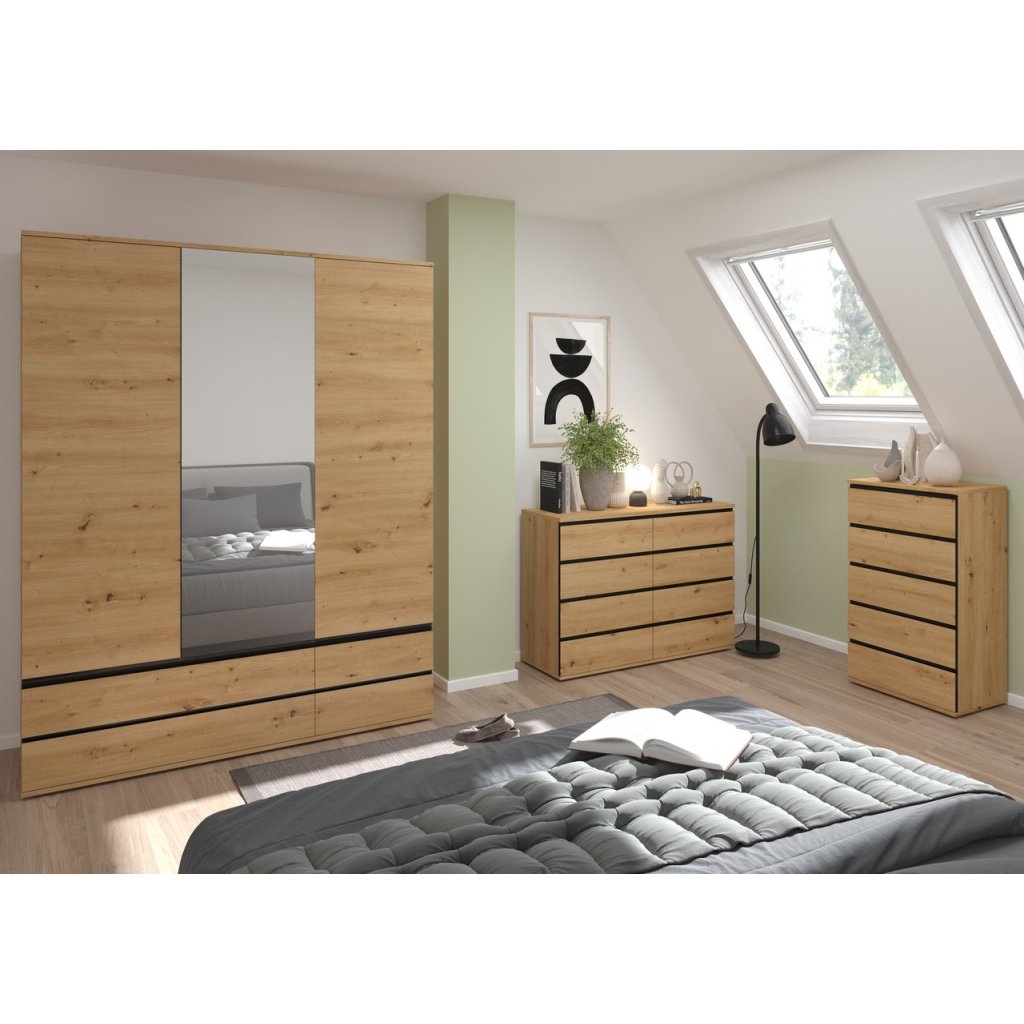 A NAXOS háromajtós, tükrös gardrób rengeteg helyet kínál ruhák tárolására. A középső ajtón egy nagyméretű tükör található, az alsó részben pedig fiókok formájában kínált tárolóhelyet is értékelni fogod. A fogantyú nélküli rendszer minimalista megjelenést biztosít, a fekete lécek pedig modern és elegáns megjelenést kölcsönöznek.
