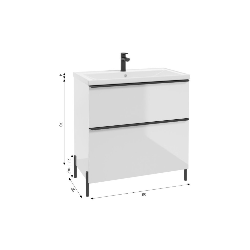A luxus NINO fürdőszobaszekrény fehér fényes kivitelben, 80 cm szélességgel és 45 cm mélységgel nagyszerű választás azoknak az enteriőröknek, amelyek a... Letisztult és elegáns megjelenés optikai térnövekedéssel. A fényes felület hatékonyan visszaveri a fényt, így a fürdőszoba tágasabbnak és világosabbnak tűnik, amit különösen a kisebb terekben fog értékelni. A szekrények biztosítják a... A rengeteg tárolóhely és a fekete fém elemek modern, kontrasztos megjelenést kölcsönöznek a garnitúrának . A fürdőszobaszekrény két lágyan záródó fiókkal rendelkezik. A lábak és a fogantyúk fekete színűek.