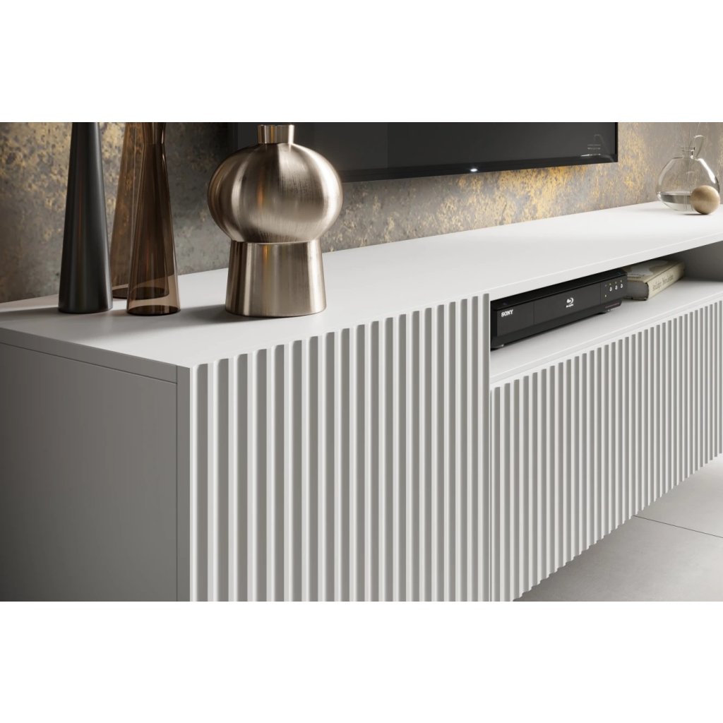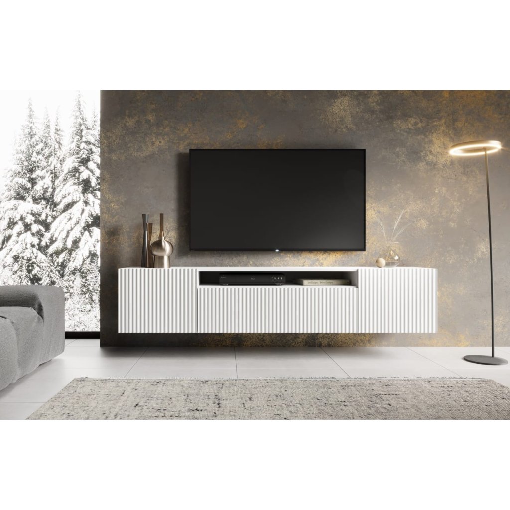 A NOEMI fali TV-állvány egy stílusos és praktikus bútordarab, amely tökéletesen kiegészíti a modern nappalit. Az elegáns dizájn a barázdált előlappal egyszerre luxus és időtlen hatást kelt. Az átgondolt belső elrendezés rengeteg helyet kínál a televíziós eszközöknek, kiegészítőknek és apró tárgyaknak. A stabil szerkezet és nyitórendszer kényelmes és csendes használatot biztosít minden nap. A matt fehér TV-állvány 200 cm hosszú.