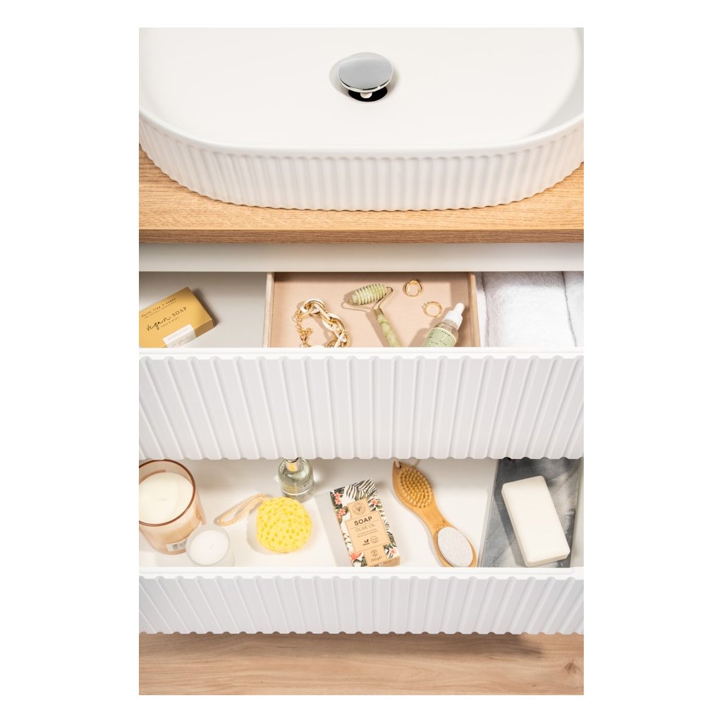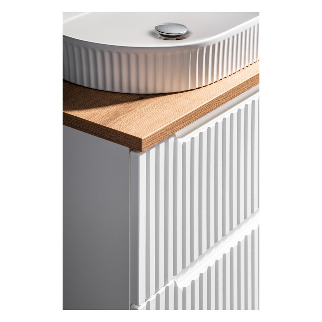 A NOVA White 82-50-2S mosdószekrény két fiókkal rendelkezik, amelyek csendes záródású mechanizmussal vannak felszerelve. A NOVA WHITE kollekció fürdőszobaszekrényei kisebb mélységgel készültek. Ez a tulajdonság, a mosdókagylók és kiegészítők választékával együtt, hangsúlyozza a sokoldalúságát és alkalmazkodóképességét, lehetővé téve elegáns és funkcionális megoldásokat még kis belső terekben is. A NOVA Cashmere és NOVA Oak fürdőszobakollekciókkal együtt rugalmas alkalmazkodást tesz lehetővé az egyéni igényekhez.