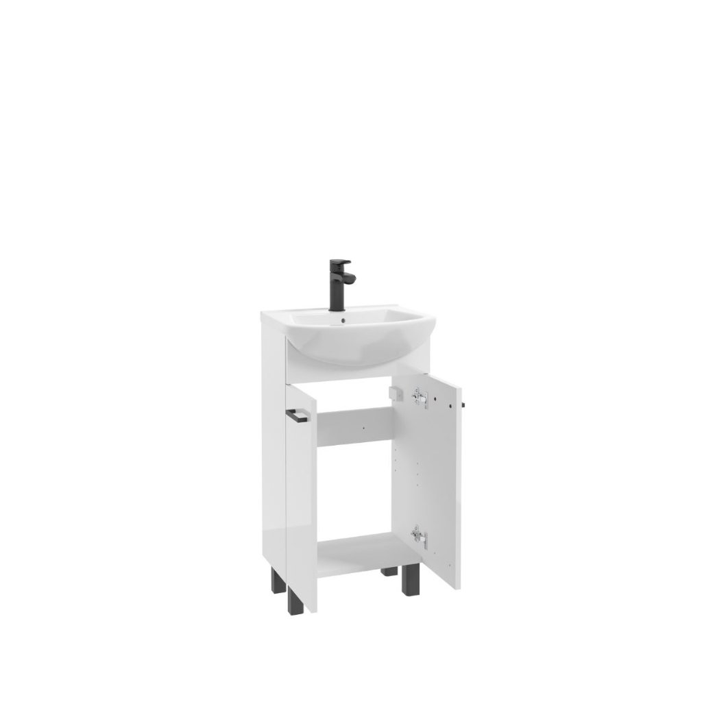 Fürdőszoba szekrény mosdóval ÚJDONSÁG Fehér D45 | 45 cm- es modern fehér fényű, finom fényes felületével hívja fel magára a figyelmet, amely szépen visszaveri a fényt, és frissességet és tisztaságot kölcsönöz a térnek . A fürdőszobai szekrény fekete lábakkal és fekete fogantyúkkal egészül ki. A szekrény ára egy fehér Tomaso 45 mosogatót tartalmaz. A szekrény két ajtós. Adja meg fürdőszobájának azt a luxust, amit megérdemel.