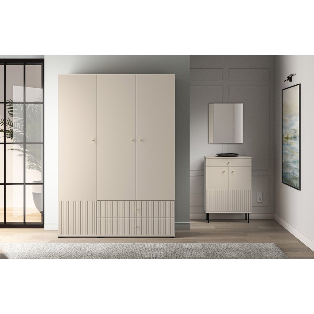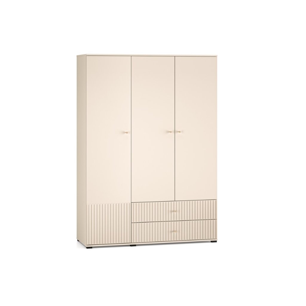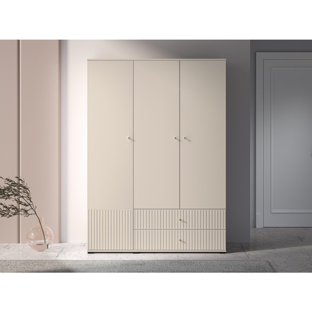A tökéletes OLIVIA 22 gardrób praktikus, magas, fekete lábakkal rendelkezik. A gardrób divatos kasmír színű , az ajtó alján pedig barázdák díszítik. A függőleges barázdák hangsúlyozzák a gardrób eleganciáját és karakterét , textúrát és tapinthatóságot kölcsönöznek a térnek, érdekes vizuális kontrasztot teremtve a sima felületekkel. Az OLIVIA gardrób háromajtós, fiókokkal, polcokkal és ruhaakasztó rúddal. Kényeztesd magad egy hangulatos hellyel, ahol kényelmesen és otthonosan érezheted magad.