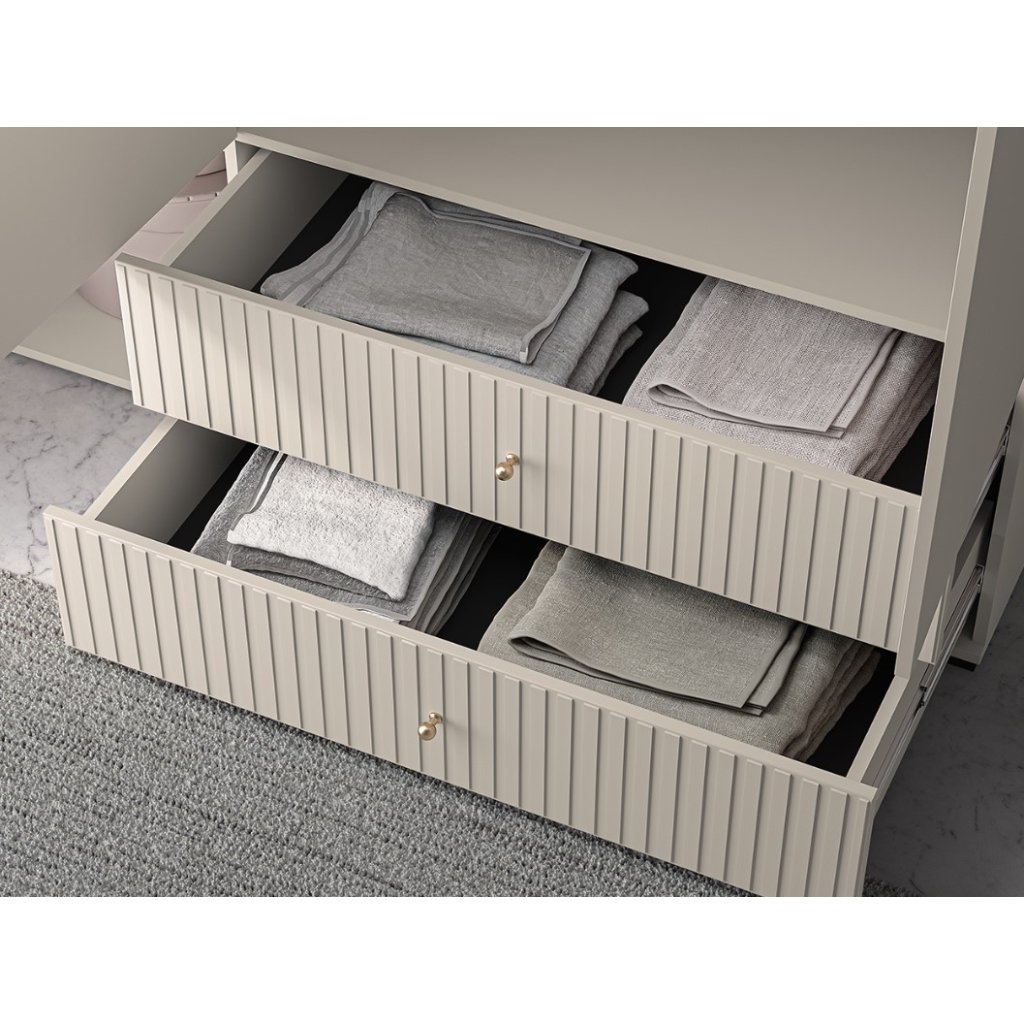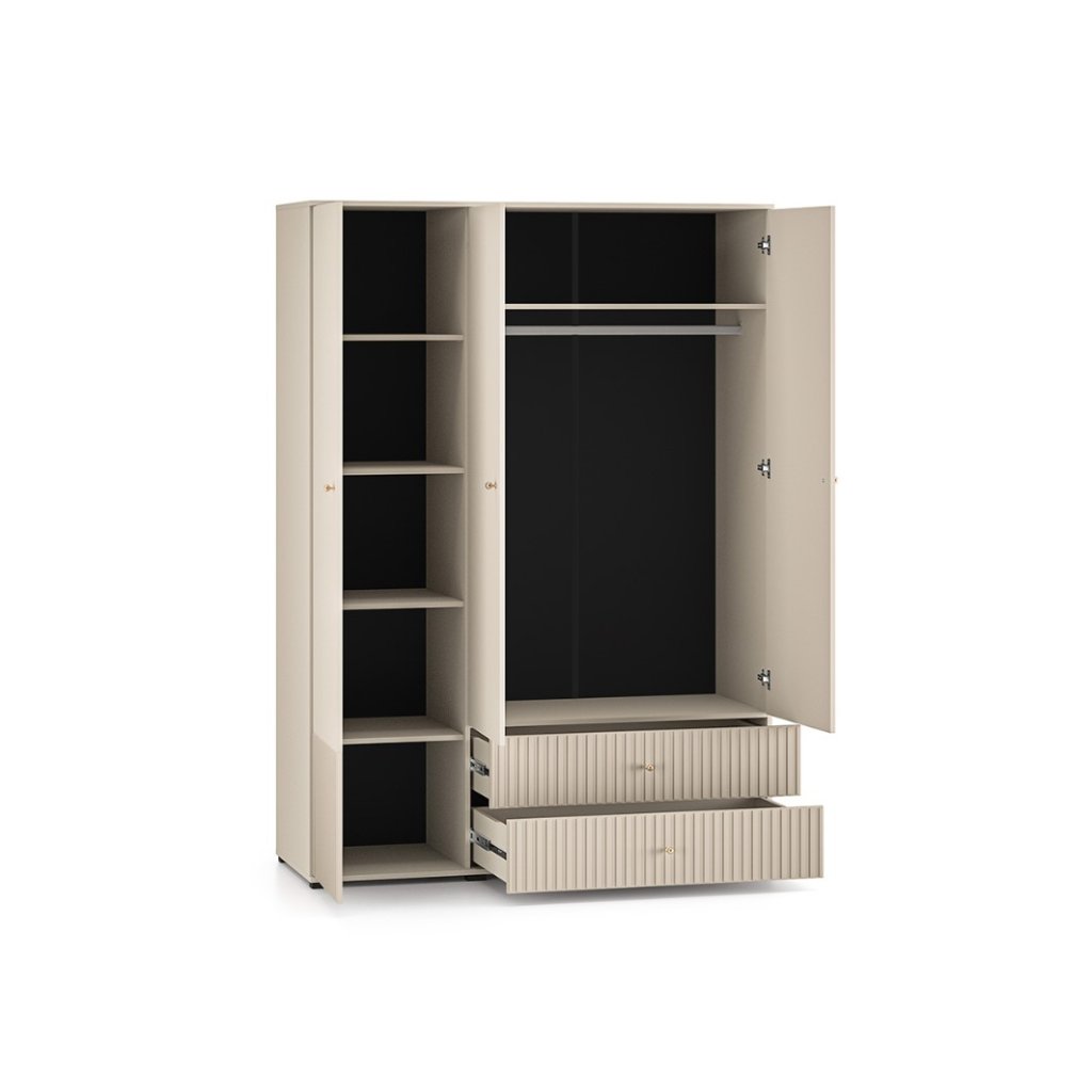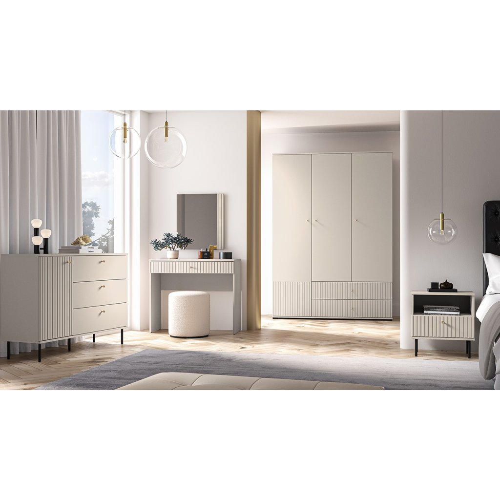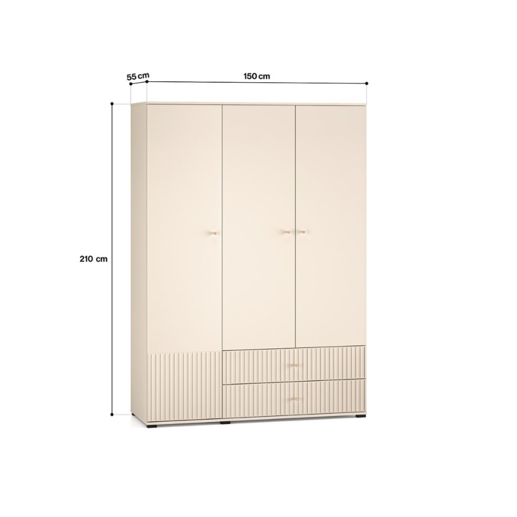 A tökéletes OLIVIA 22 gardrób praktikus, magas, fekete lábakkal rendelkezik. A gardrób divatos kasmír színű , az ajtó alján pedig barázdák díszítik. A függőleges barázdák hangsúlyozzák a gardrób eleganciáját és karakterét , textúrát és tapinthatóságot kölcsönöznek a térnek, érdekes vizuális kontrasztot teremtve a sima felületekkel. Az OLIVIA gardrób háromajtós, fiókokkal, polcokkal és ruhaakasztó rúddal. Kényeztesd magad egy hangulatos hellyel, ahol kényelmesen és otthonosan érezheted magad.