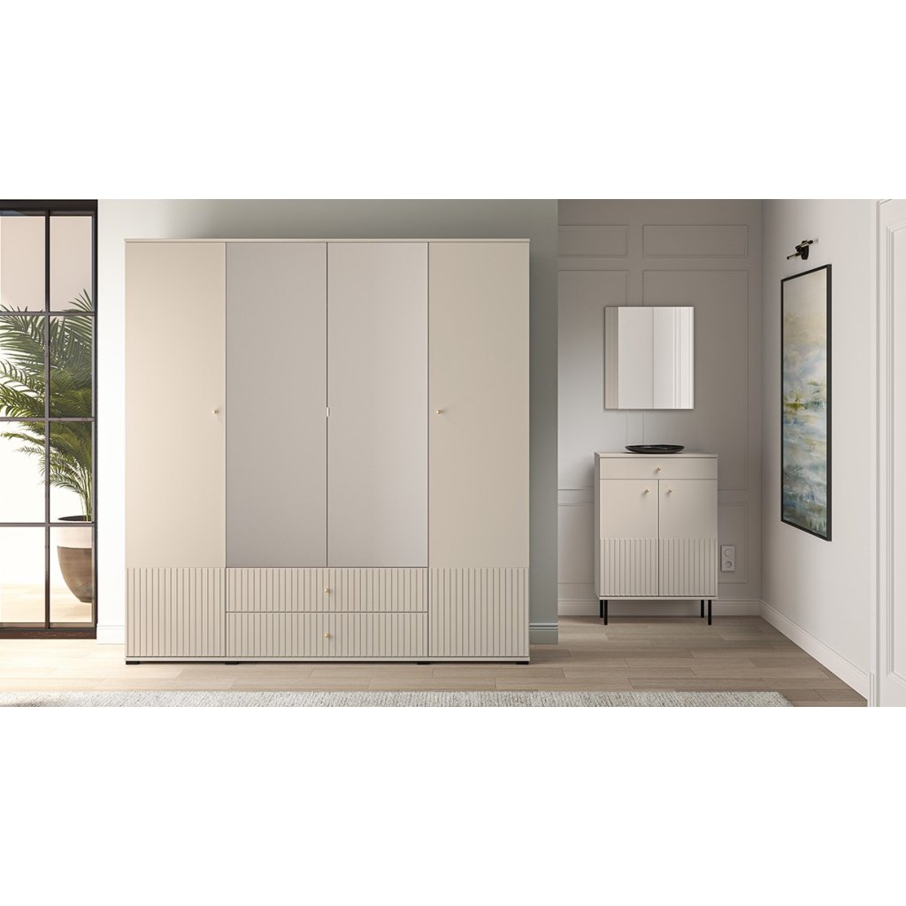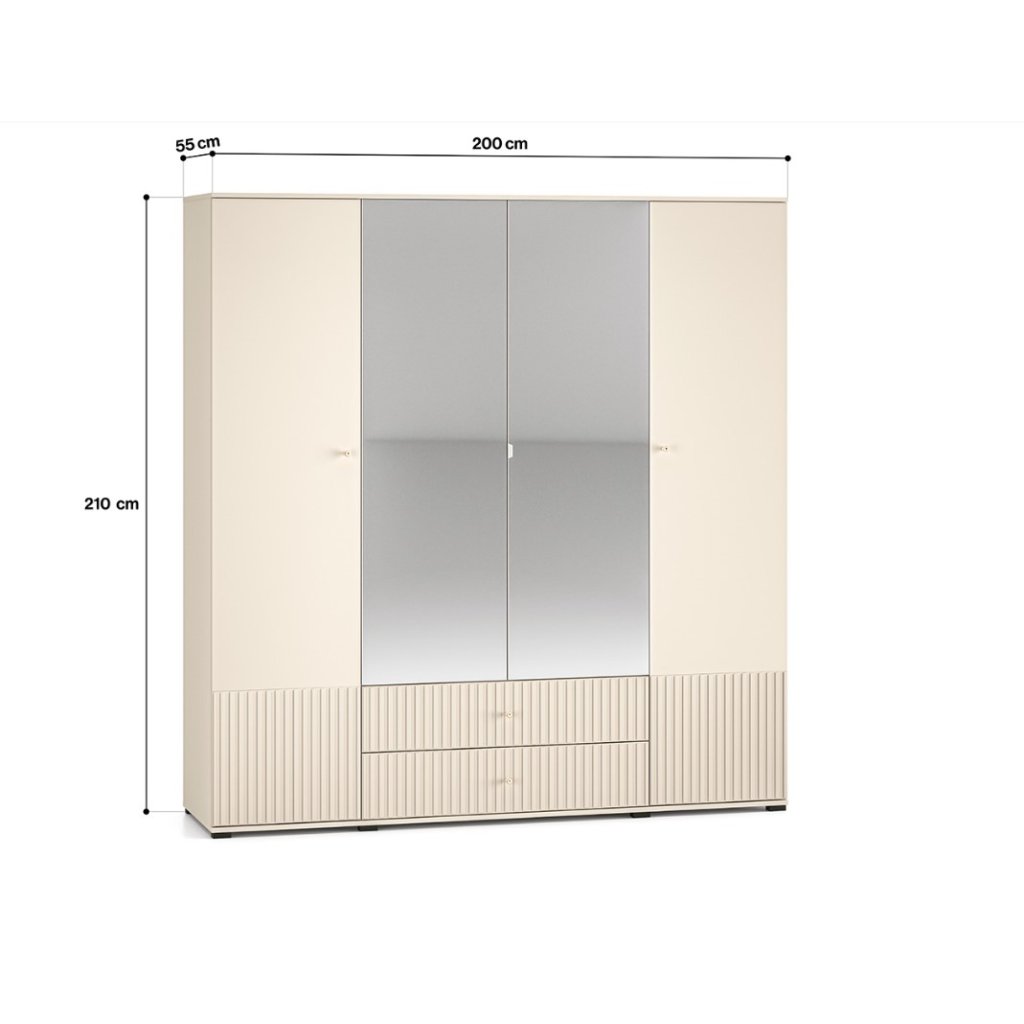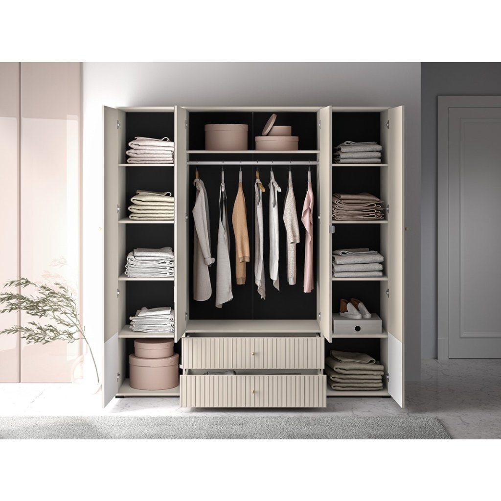 A tökéletes OLIVIA 23 gardrób praktikus, magas, fekete lábakkal rendelkezik. A gardrób divatos kasmír színű , az ajtó alján barázdák díszítik. A függőleges barázdák hangsúlyozzák a gardrób eleganciáját és karakterét , textúrát és tapinthatóságot kölcsönöznek a térnek, érdekes vizuális kontrasztot teremtve a sima felületekkel. Az OLIVIA gardrób négyajtós, fiókokkal, polcokkal és ruhaakasztó rúddal. Meríts ihletet gyönyörű és modern kínálatunkból.