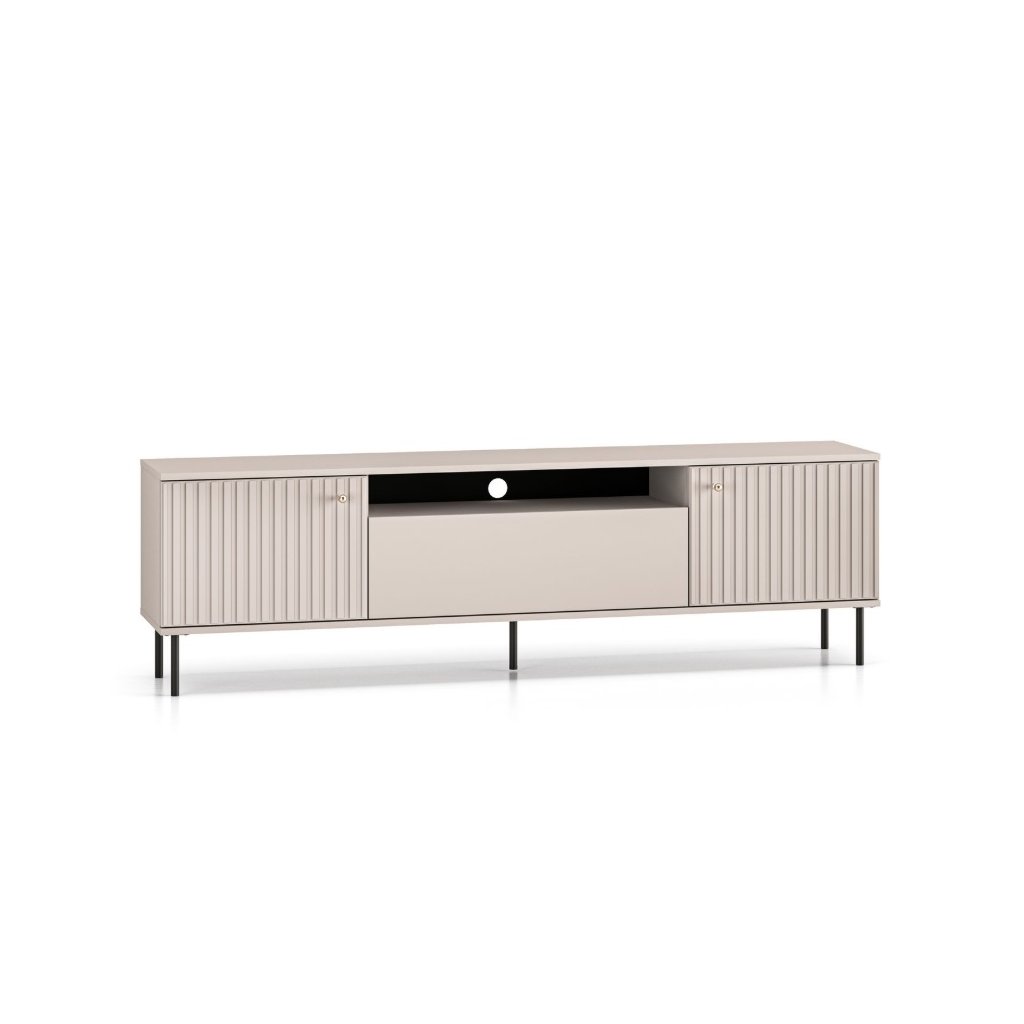 A széles és tágas OLIVIA 27 TV-állványt magas lábakon, divatos kasmír színben, az ajtókon lévő barázdák teszik élénkebbé . A függőleges barázdák hangsúlyozzák a TV-állvány eleganciáját és karakterét, textúrát és tapinthatóságot kölcsönöznek a térnek , ami érdekes vizuális kontrasztot teremt a sima felületekkel. Az OLIVIA 27 TV-állvány nyitott polccal és 2 ajtóval rendelkezik. Értékelni fogja az ajtók csendes záródását és az ABS éleket. Az asztalon egy praktikus kábelnyílás is található. Kényeztesd magad egy hangulatos hellyel, ahol kényelmesen és otthonosan fogod érezni magad.