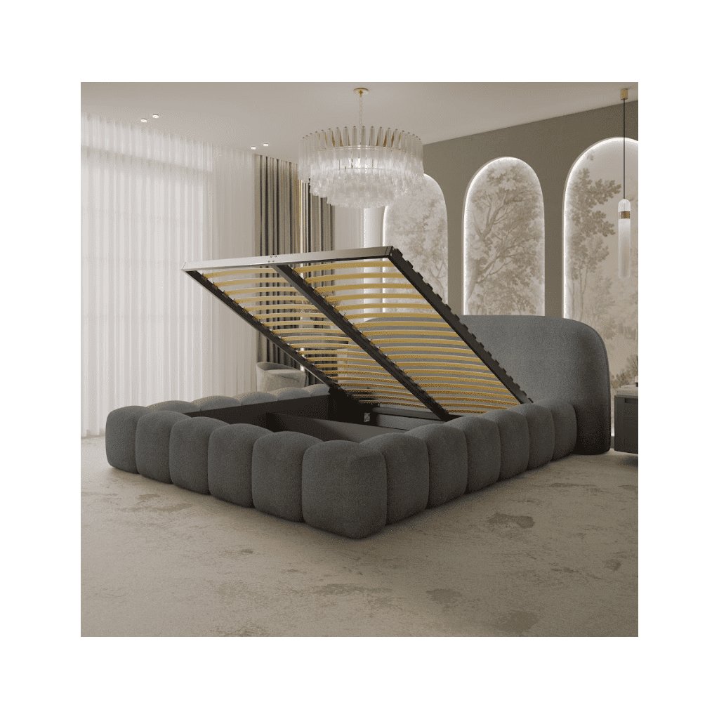Az ágy kiváló minőségű QUELLE kárpitozott anyaggal van kárpitozva, amelyet nagy kopásállóság és könnyű karbantartás jellemez. Az ágykeret LTD (laminált farostlemez) lapokból készült, amelyek tartósságukról, méretstabilitásukról és hosszú élettartamukról ismertek. A tartóelemek tömörfa elemeket használnak, amelyek nagy stabilitást biztosítanak az ágynak. A fa egy ökológiai, erős és időtálló anyag, amely hosszú távú megbízhatóságot biztosít. A puha kárpitozott részek poliuretán habbal vannak töltve, amely kellemes kényelmet és méretstabilitást biztosít. Az összecsukható rácsos ágy és a tárolórekesz fémkonzolokkal van megerősítve, amelyek biztosítják a mechanizmusok sima nyitását, stabilitását és hosszú élettartamát. Az ágy impregnálható , vagy szükség esetén univerzális tisztítószerrel tisztítható .