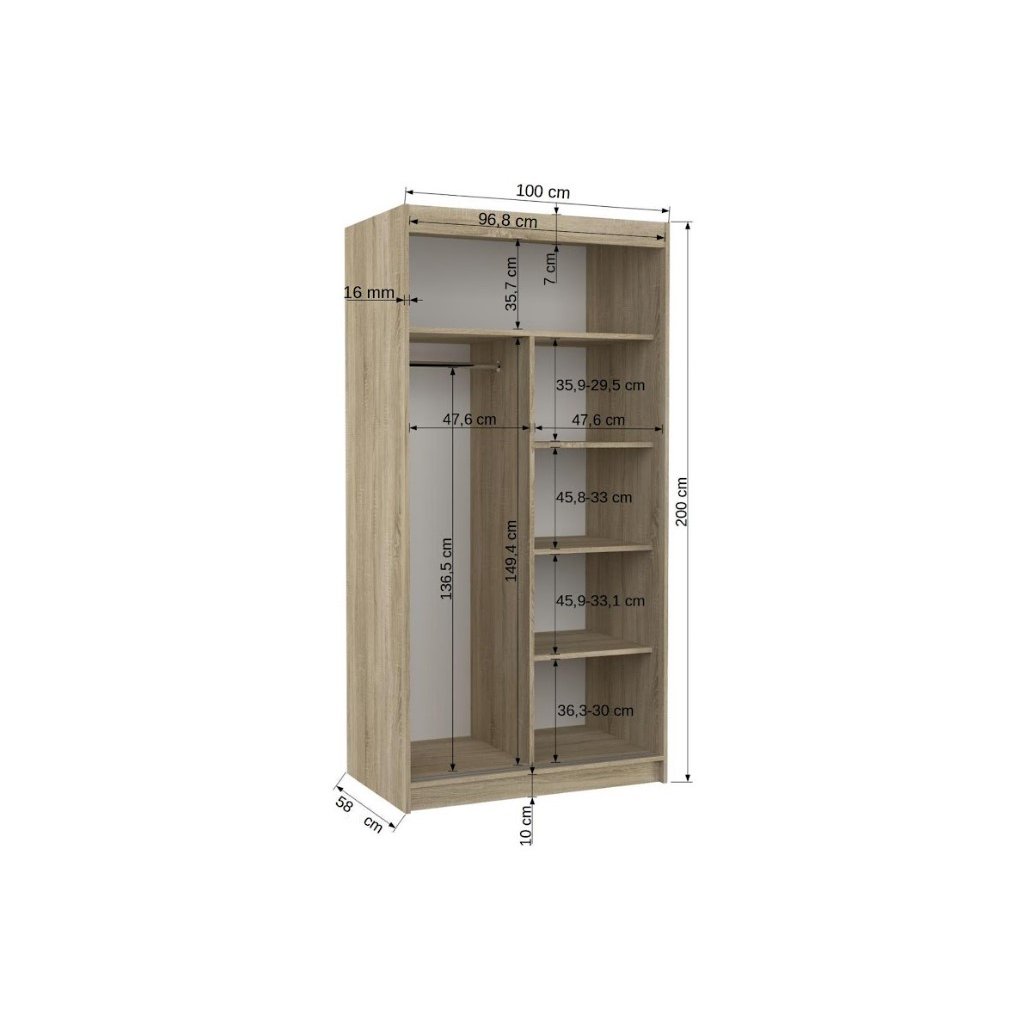Az ORLANDO fehér 100 cm-es gardróbszekrény kiváló minőségű, 16 mm vastagságú anyagokból készült, éleit pedig tartós ABS élek védik a sérülésektől . A gardróbszekrény Sevroll márkájú alumínium vezetősínekkel és egy előre ragasztott tükörrel van felszerelve. Az ajtók mentén található alumínium sínek megakadályozzák azok elgörbülését. Szétszerelt állapotban szállítjuk, beleértve az összes szükséges alkatrészt és az összeszerelési útmutatót. A karbantartás egyszerű - csak használjon nedves ruhát vagy bútortisztítót.