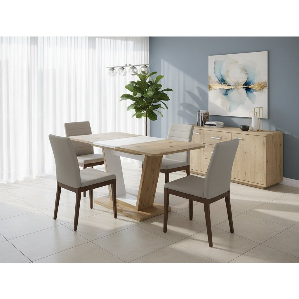 Praktikus kihúzható étkezőasztal A NIGEL asztal bármelyik étkező vagy konyha fénypontjává válhat. Ez az eredeti és modern asztal 160 cm-ig bővíthető. A kiváló minőségű és stílusos asztalláb stabilitást és egyediséget kölcsönöz. A fehér szín és a tölgyfa kézműves dekoráció kombinációja harmonikus kontrasztot teremt, amely minden ebédet vagy vacsorát felfrissít. Az étkezőasztalt szétszerelt állapotban szállítjuk. Az asztal 6-8 fő befogadására alkalmas.
