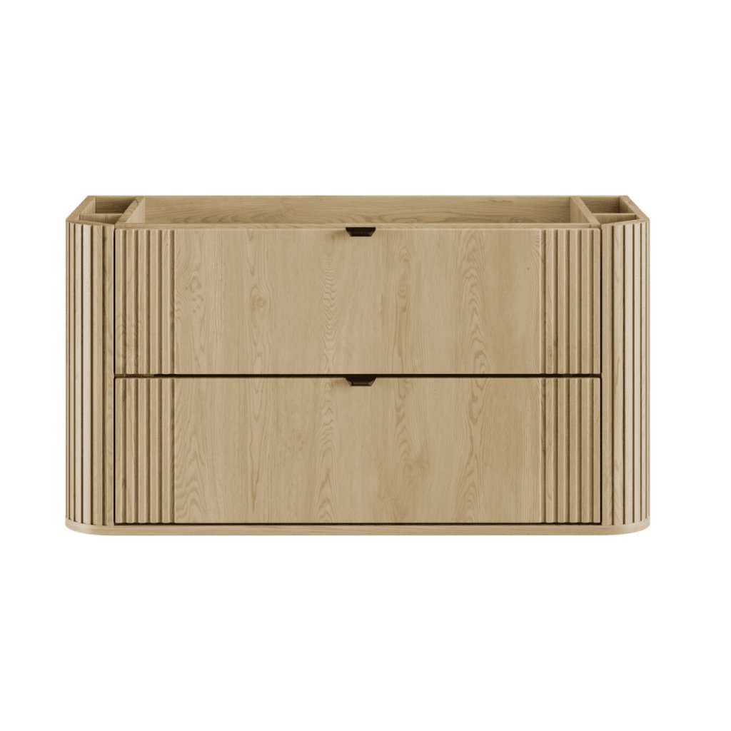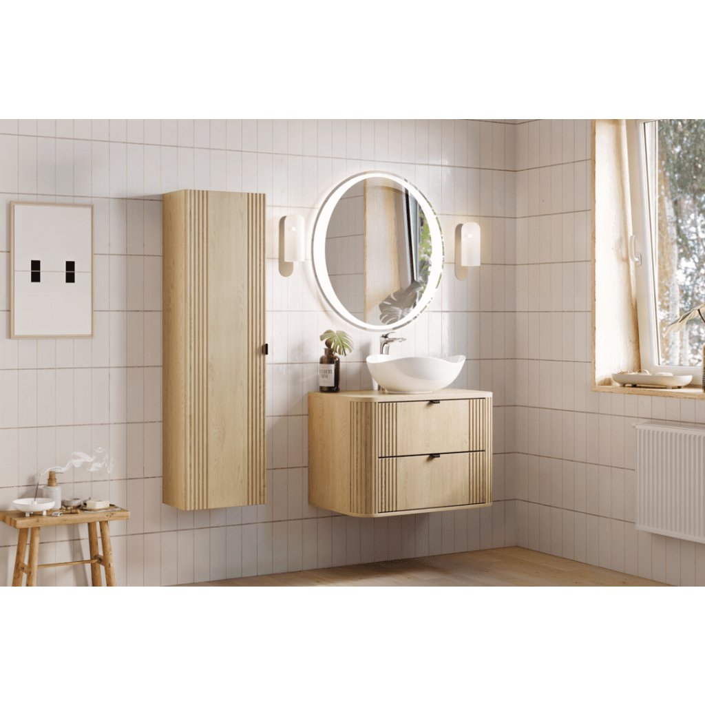Fedezze fel az időtlen design szépségét a modern OVALIA fürdőszoba szettel, amely ötvözi a fa természetes megjelenését , a minimalista szettakat és a stílusos elemeket. A világos fa dekoráció a szekrények finom függőleges marásával kombinálva elegáns és otthonos egyszerre. Az OVALIA Cremona 100 cm-es mosdószekrény feltűnő díszítőeleme lesz a belső térnek, és a skandináv stílus kedvelőinek is tökéletes választás. A fiókok természetesen halkan záródnak és teljesen kihúzhatók.