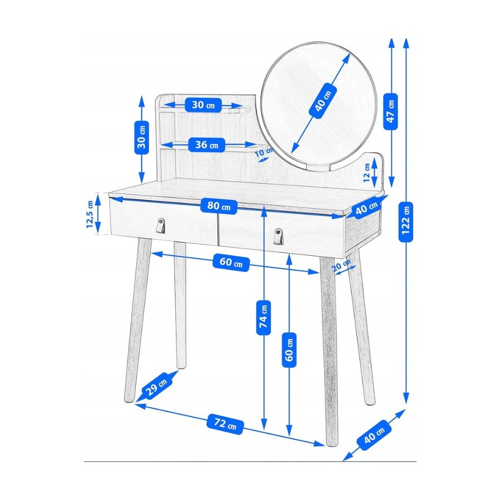 A SCANDI 3 LED CM-254152 praktikus fésülködőasztal csodálatosan kiegészíti a női gardróbot vagy hálószobát. Egy nő számára ez egy eredeti sarok sminkhez és frizurához. A fiókok közül kettő eredeti fogantyúkkal és polcokkal megvan ideális kozmetikumok, ékszerek, írószerek és egyéb apró tárgyak tárolására. A fésülködőasztal munkaasztalként is használható. Az asztal két praktikus fiókot , két polcot és praktikusat tartalmaz kerek LED-es tükör.