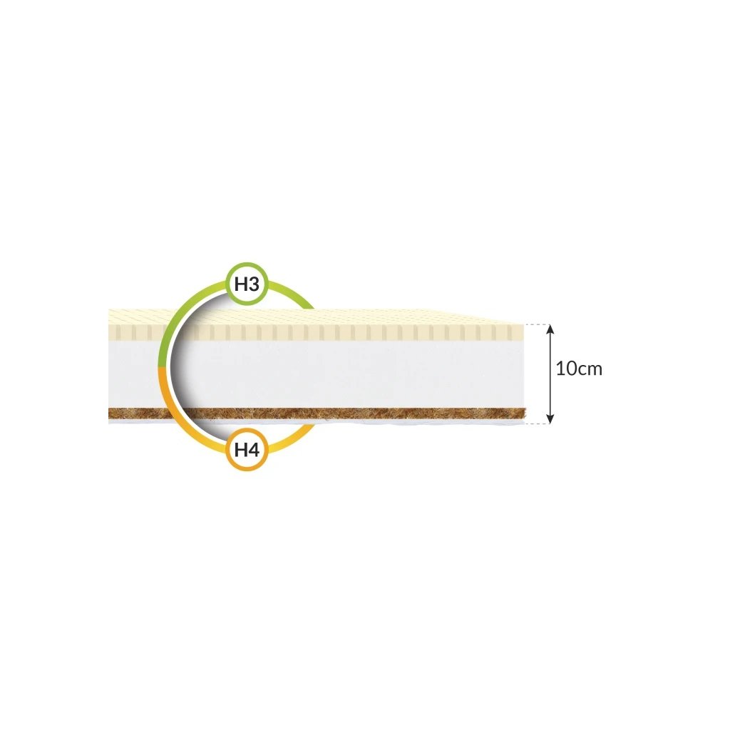 A matrac poliuretán habból készült, egyik oldalán latex réteggel, a másik oldalán kókuszdió betéttel bevonva . Ez egy természetes anyag, amely stabilitást és légáteresztő képességet biztosít. Ennek köszönhetően kétoldalas modell, különböző keménységi fokú kivitelben - az egyik oldal kemény, a másik puha. Két különböző keménységi fok lehetővé teszi, hogy a személyes preferenciáinak megfelelően válasszon. A kókuszdiót tartalmazó természetes betétnek köszönhetően a matrac szellős és antiallergén tulajdonságokkal rendelkezik. A perforált latex réteg, amely tökéletesen alkalmazkodik az alvó alakjához, kivételes kényelmet biztosít. A poliuretán hab ellenáll a deformációnak, amelyben nem szaporodnak meg a poratkák, baktériumok és más mikroorganizmusok.