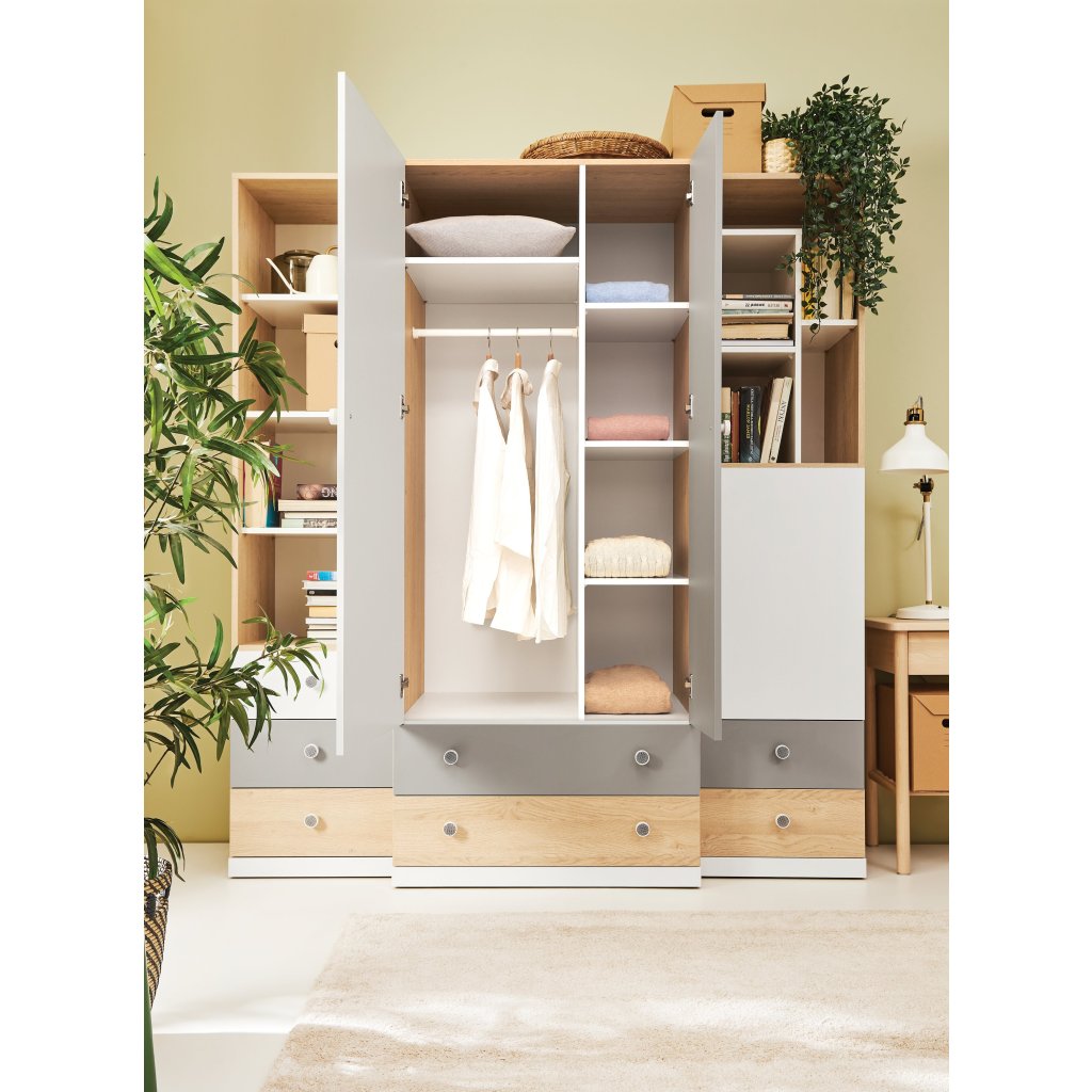 A PIXEL PX3 ruhásszekrény jobb oldalán praktikus ruhapolcokkal, a bal oldalon pedig egy polcos fogas található . Az alsó részben 2 praktikus fiók található, az ABS éleket a mindennapi használat során értékelni fogod. A teljes szett meleg színekben készült, így nagyon otthonos és harmonikus a megjelenése. A bútort szétszerelt állapotban szállítjuk. A PIXEL gyerekbútorok egyszerűek, elegánsak és a legújabb trendeket követik. A tölgy, a fehér és a szürke kellemes kombinációja fiúknak és lányoknak egyaránt illik. A kollekció számos elemet kínál, így elképzeléseid és a tér adta lehetőségek szerint rendezheted be a gyerekszobát.