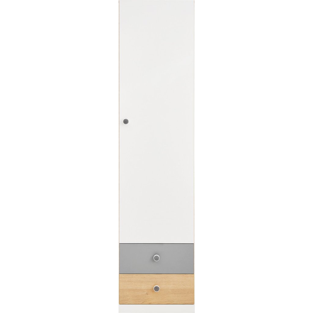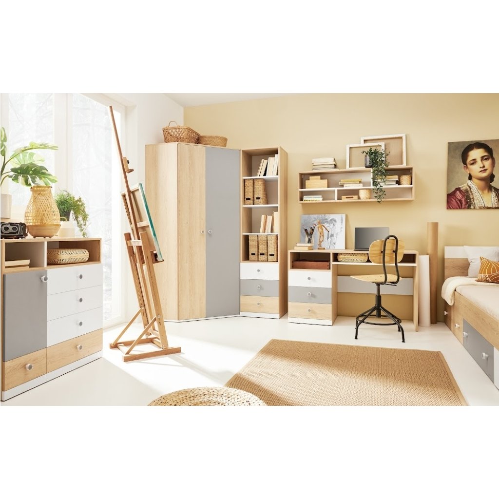 A PIXEL gyerekbútor egyszerű, elegáns és a legújabb trendeket követi. A tölgy, fehér és szürke kellemes kombinációja fiúknak és lányoknak egyaránt illik. A kollekció számos elemet kínál, így a gyerekszobát az Ön igényei és a rendelkezésre álló hely szerint rendezheti be. A polcos szekrény praktikus polcokkal rendelkezik, az alsó részben 2 praktikus fiók található. Az ABS éleket a mindennapi használat során értékelni fogja. A teljes szett meleg színekben készült, így otthonosnak és harmonikusnak tűnik. A bútort szétszerelt állapotban szállítjuk.