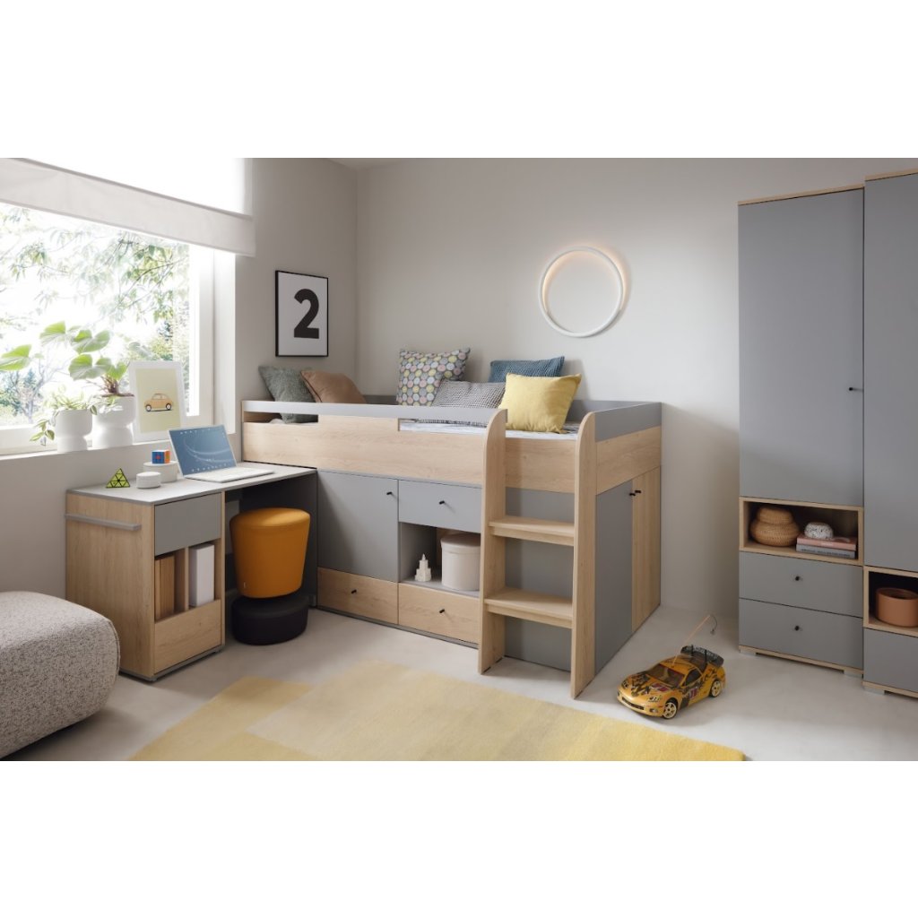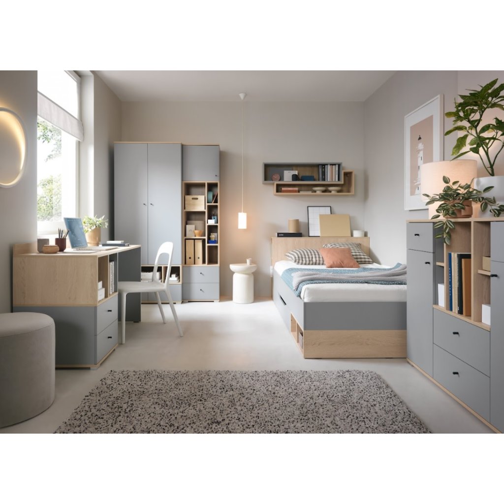 Az ORO OR03 könyvespolc harmonikus környezetet teremt, amely ösztönzi a kreativitást, a kíváncsiságot és a tanulást. A szürke és tölgyfa semleges tónusai , kiegészítve a finom fekete fogantyúkkal, nyugalmat árasztanak a szobába. Időtlen stílus és kellemes hangulat . A bútorok természetesen illeszkednek bármilyen belső térbe, és gyermekeddel együtt fejlődnek a képzelet első lépéseitől az iskolai feladatokig. A fiókokkal és polcokkal ellátott magas polc tágas.