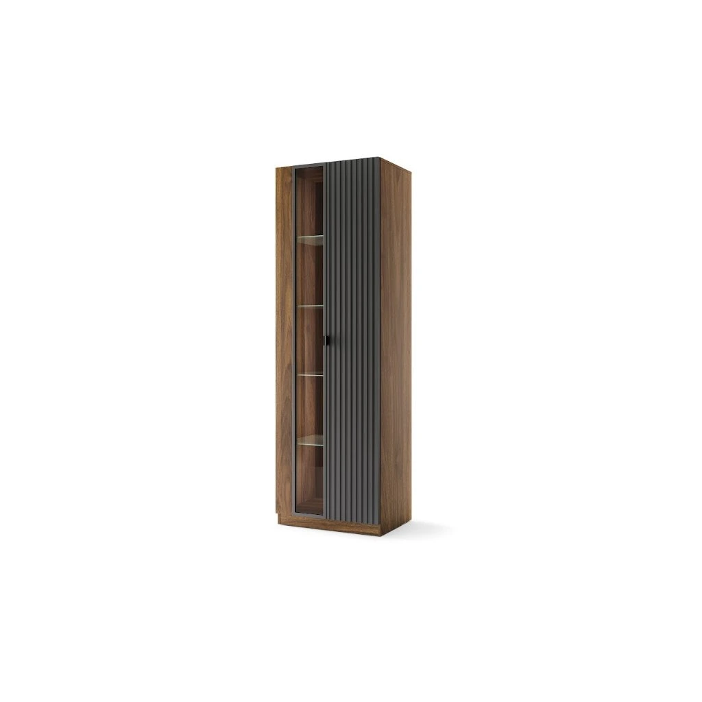 A RADIUM 11 vitrin a modern dizájn, a funkcionalitás és a kényelem ideális kombinációját képviseli a mindennapi használatra. A Columbia diófa dekor és a matt fekete elegáns kombinációja időtlen megjelenést kölcsönöz, amely modern és minimalista enteriőrökbe egyaránt illik. A vitrin bőséges tárolóhelyet kínál elektronikai cikkek, könyvek, dekorációk és mindennapi tárgyak számára. Az integrált LED-világítás kellemes hangulatot teremt. A használati kényelmet növeli a lágyan záródó rendszer, amely biztosítja az ajtók csendes és sima záródását .